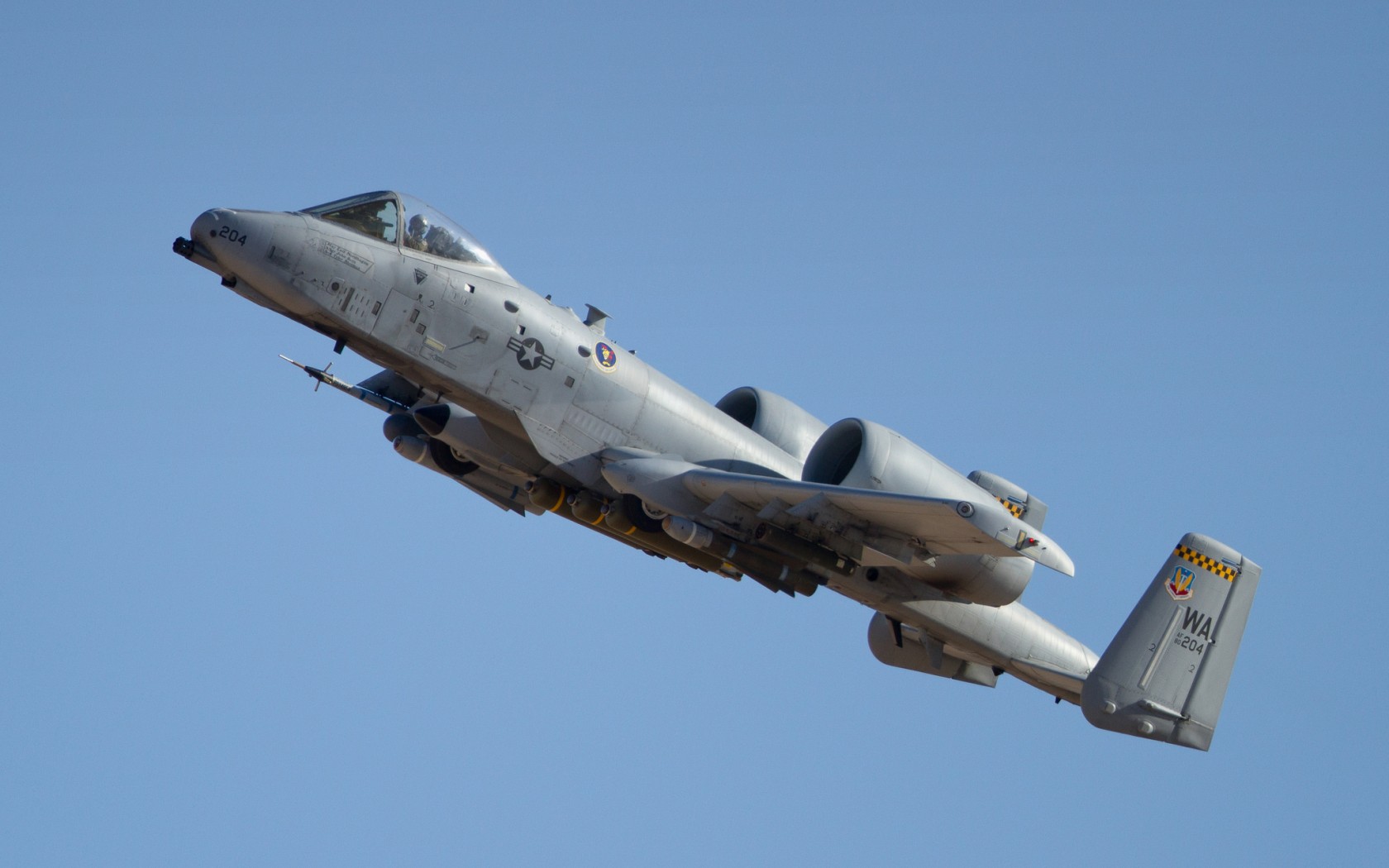 Description: A fighter jet flying through a blue sky with a propeller on it's side and a pilot on the back of the jet.