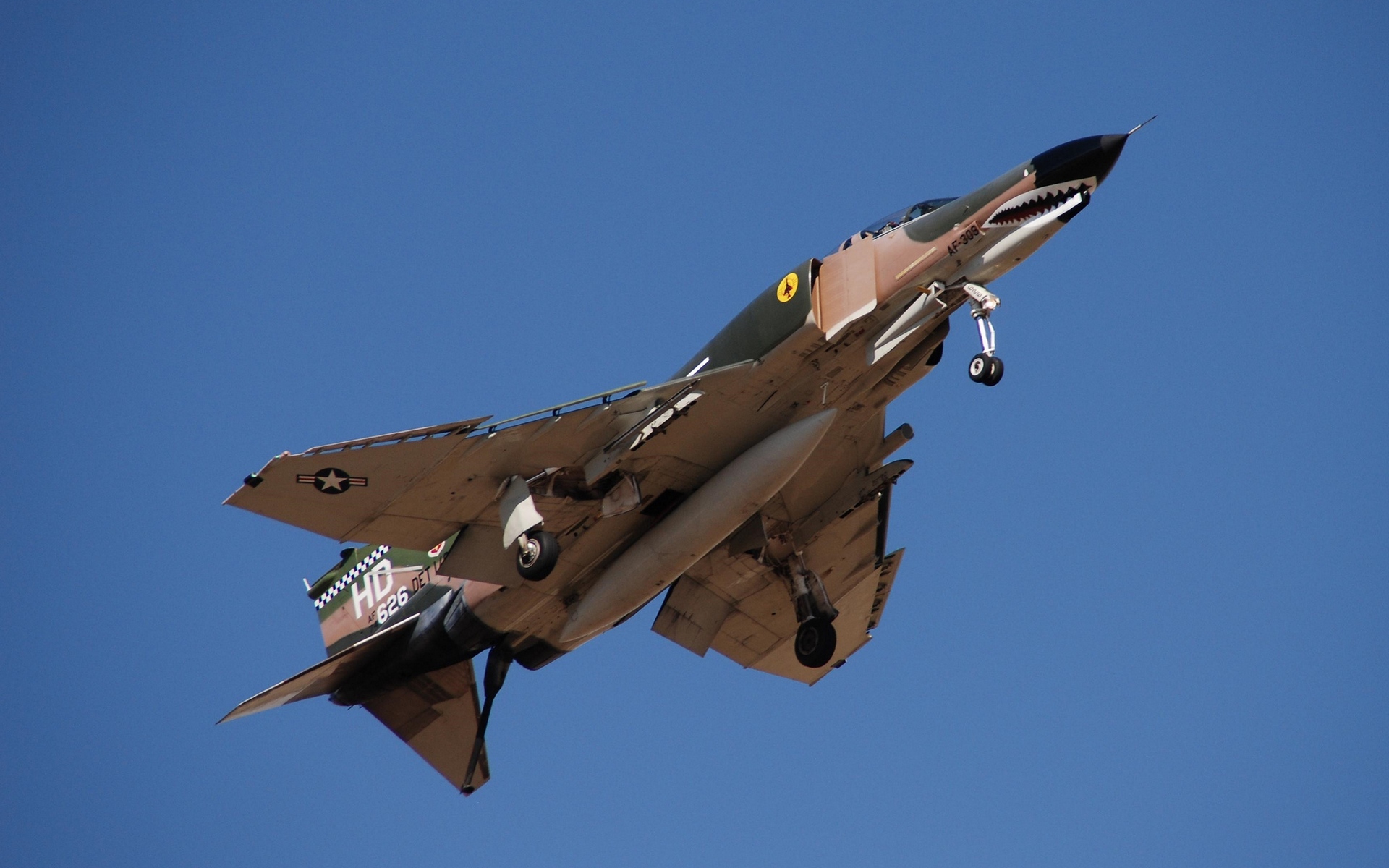 Description: A fighter jet flying through a blue sky with a propeller on it's side and a landing gear down.