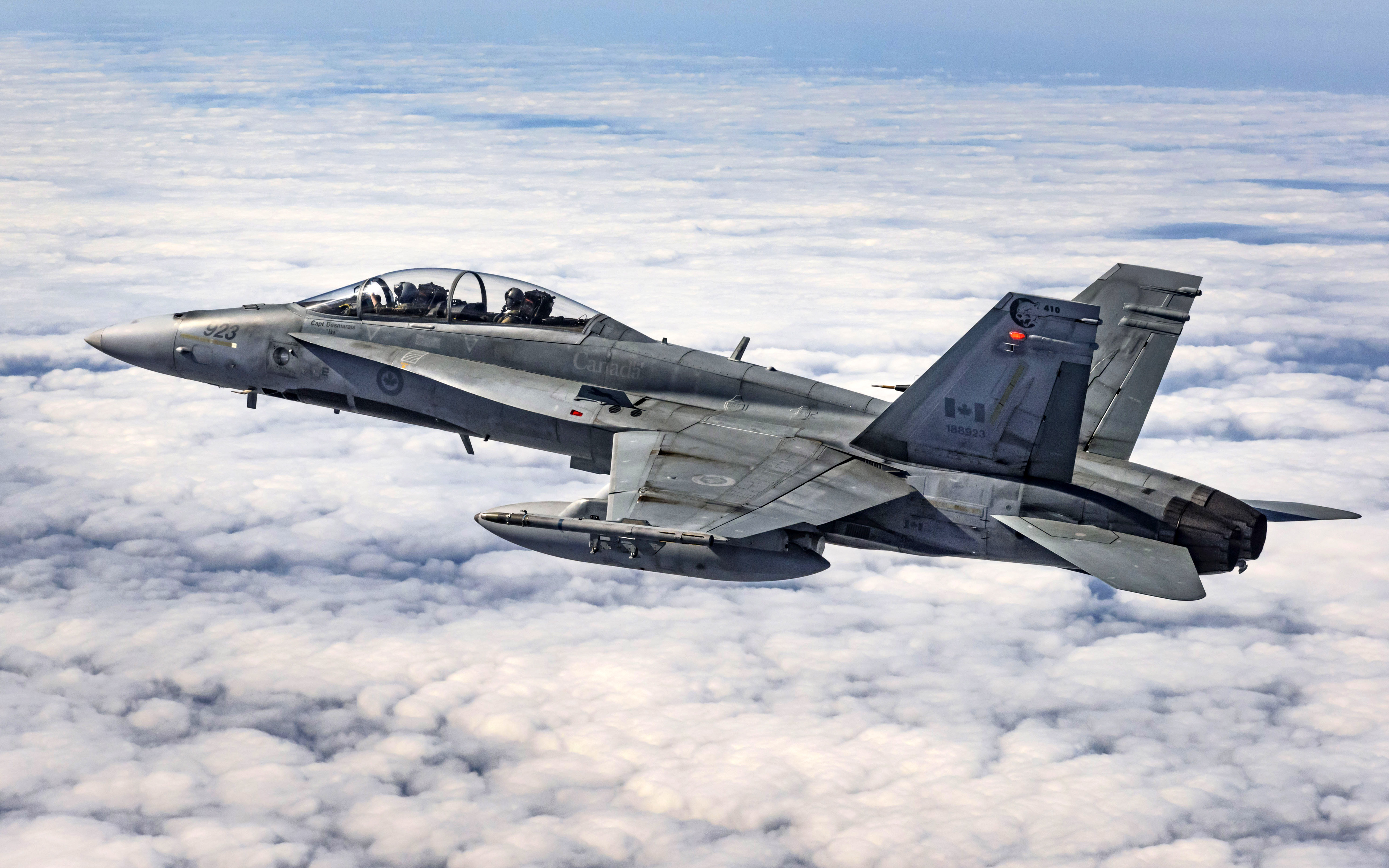 Description: A fighter jet flying through the air above clouds in the sky with a pilot inside of it's cockpit.