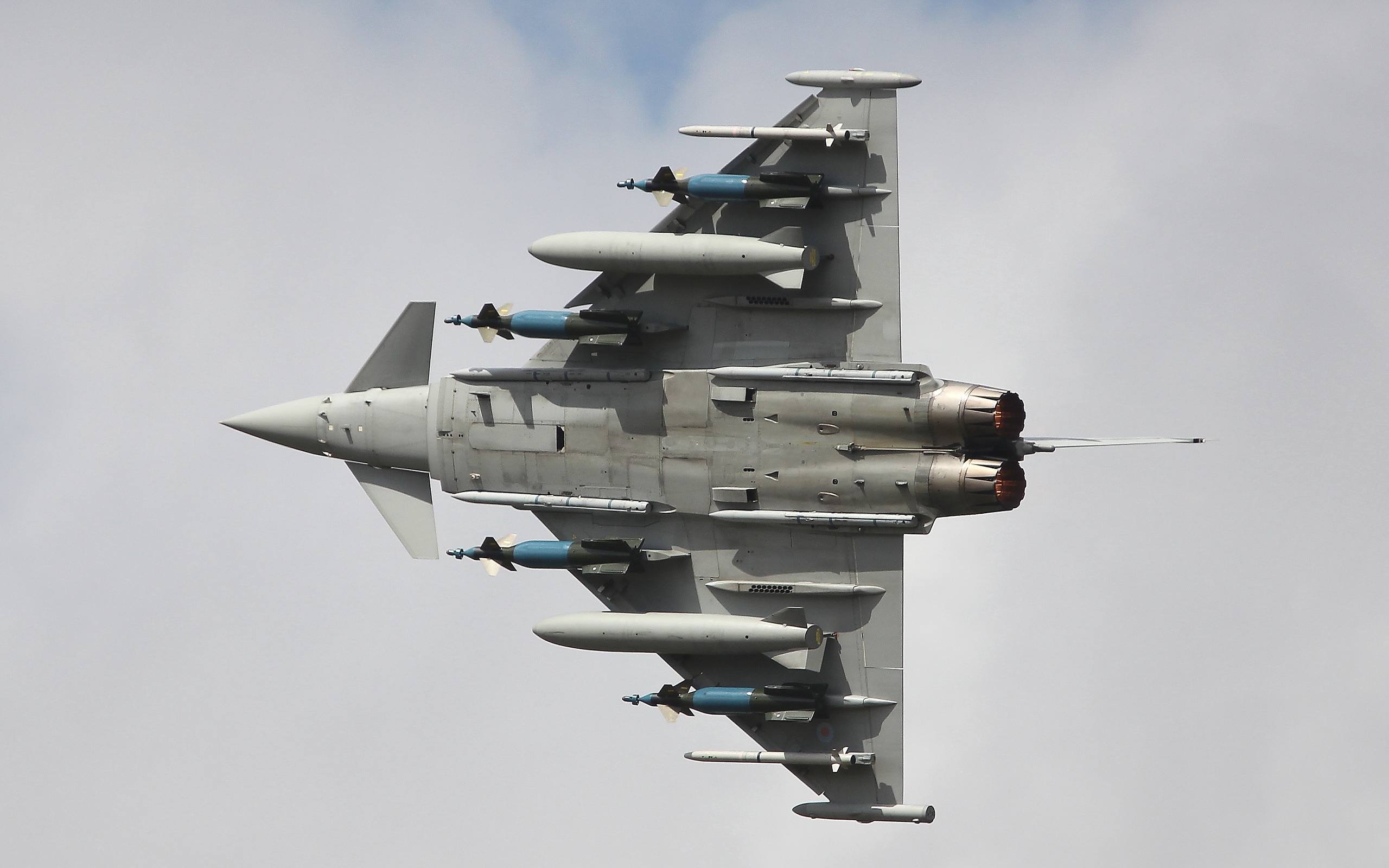 Description: A fighter jet flying through a cloudy sky with four engines on it's side and four on the front.
