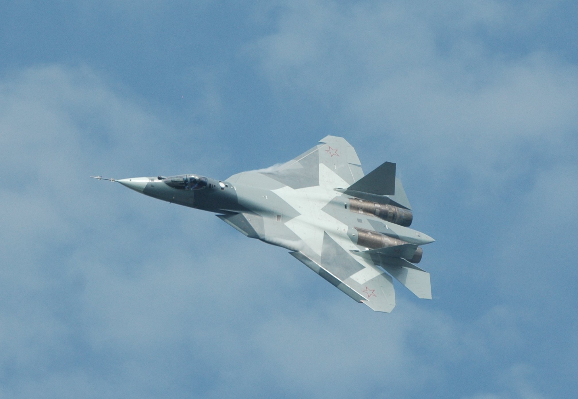 Description: A fighter jet flying through a cloudy blue sky with a jet engine on it's side and a missile on its nose.