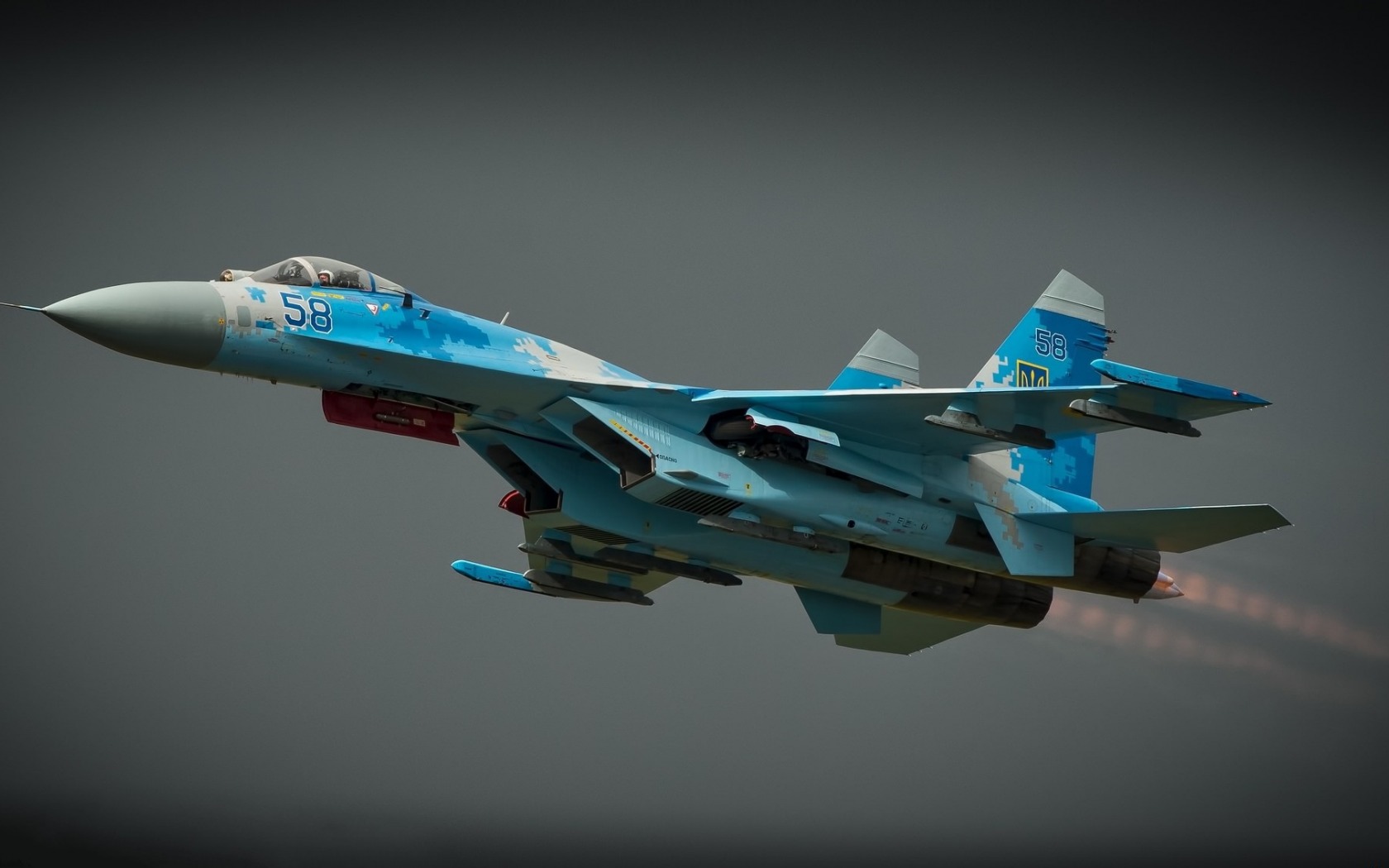 Description: A fighter jet flying through a cloudy sky with smoke coming out of it's back end and a red tail.