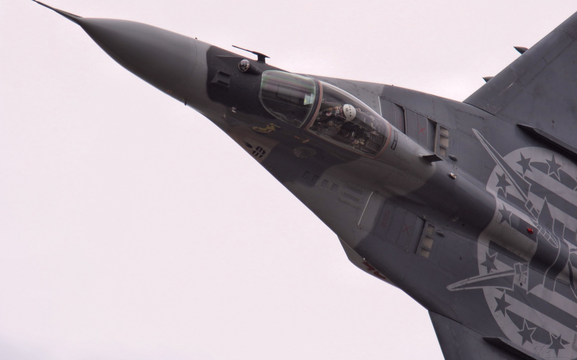 Description: A fighter jet flying through a cloudy sky with a star on it's side and a logo on the side.