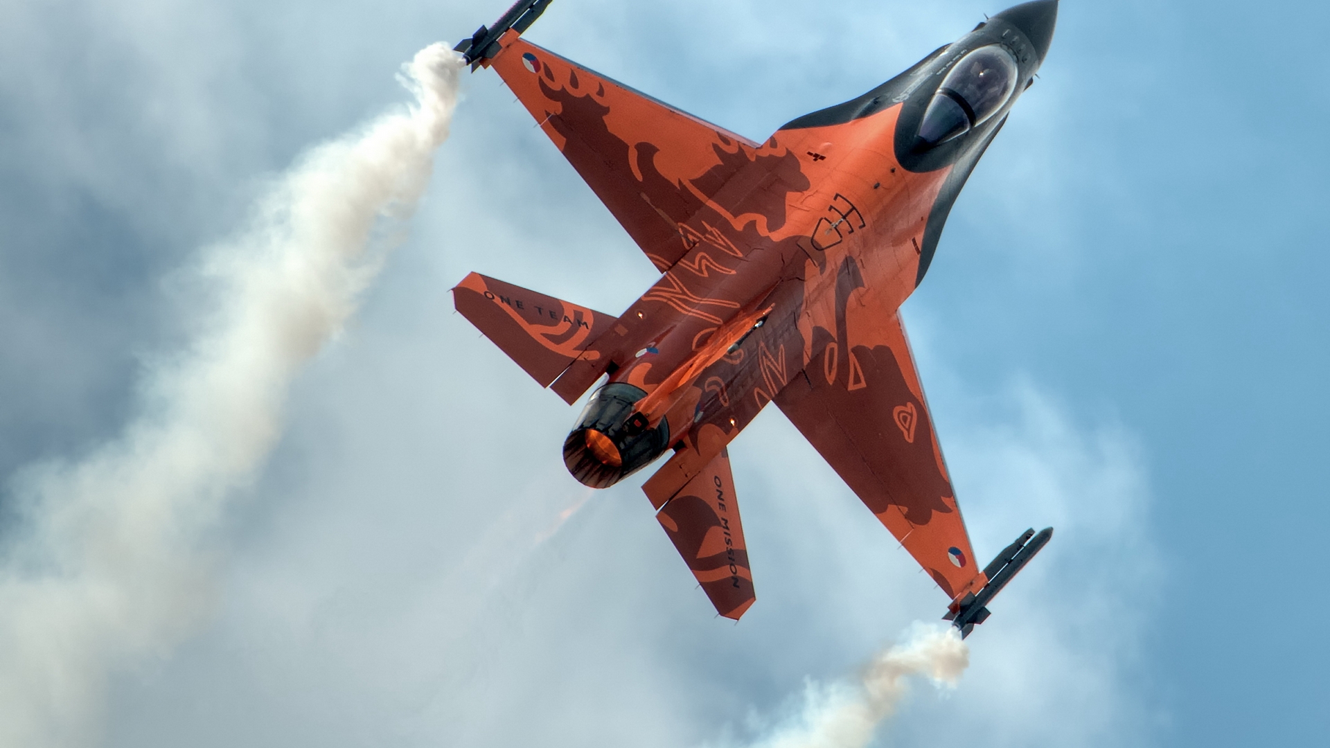 Description: A fighter jet flying through a cloudy blue sky with smoke coming out of it's back end and a tail.
