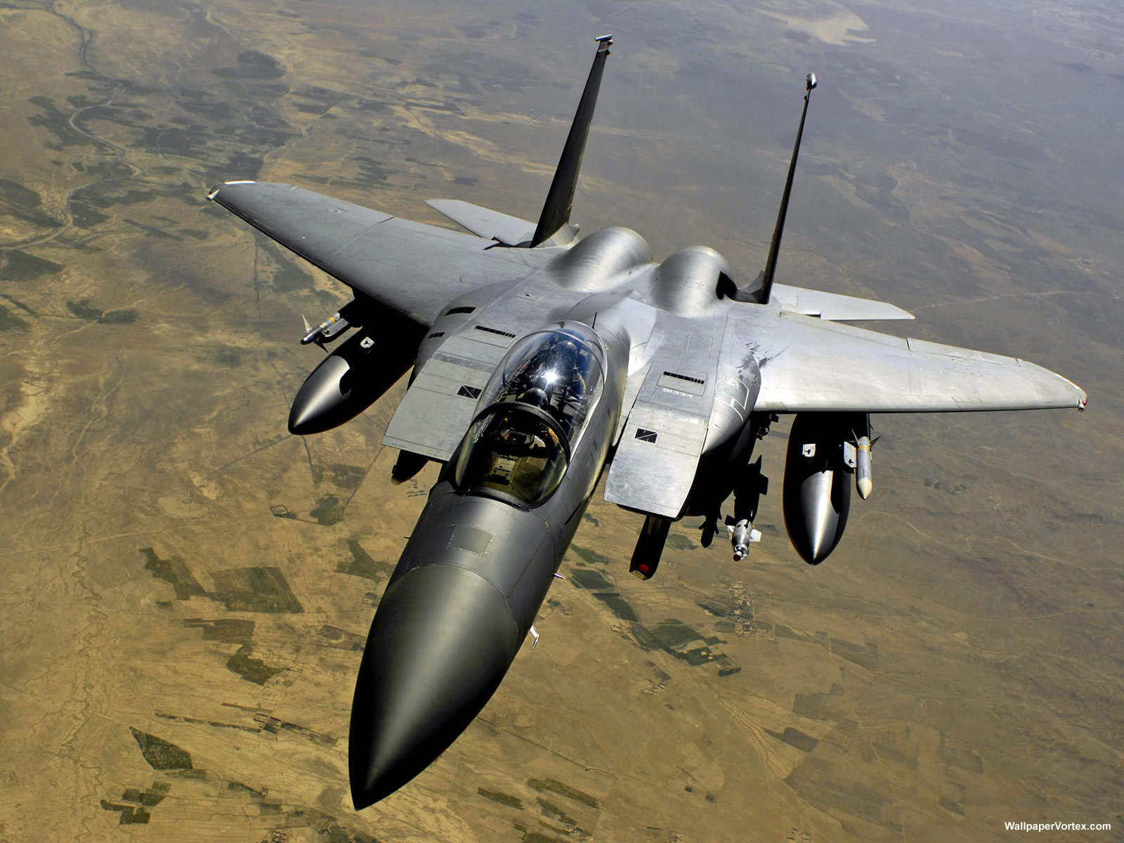 Description: A fighter jet flying through the air over a desert landscape with a sky background and a brown area in the foreground.