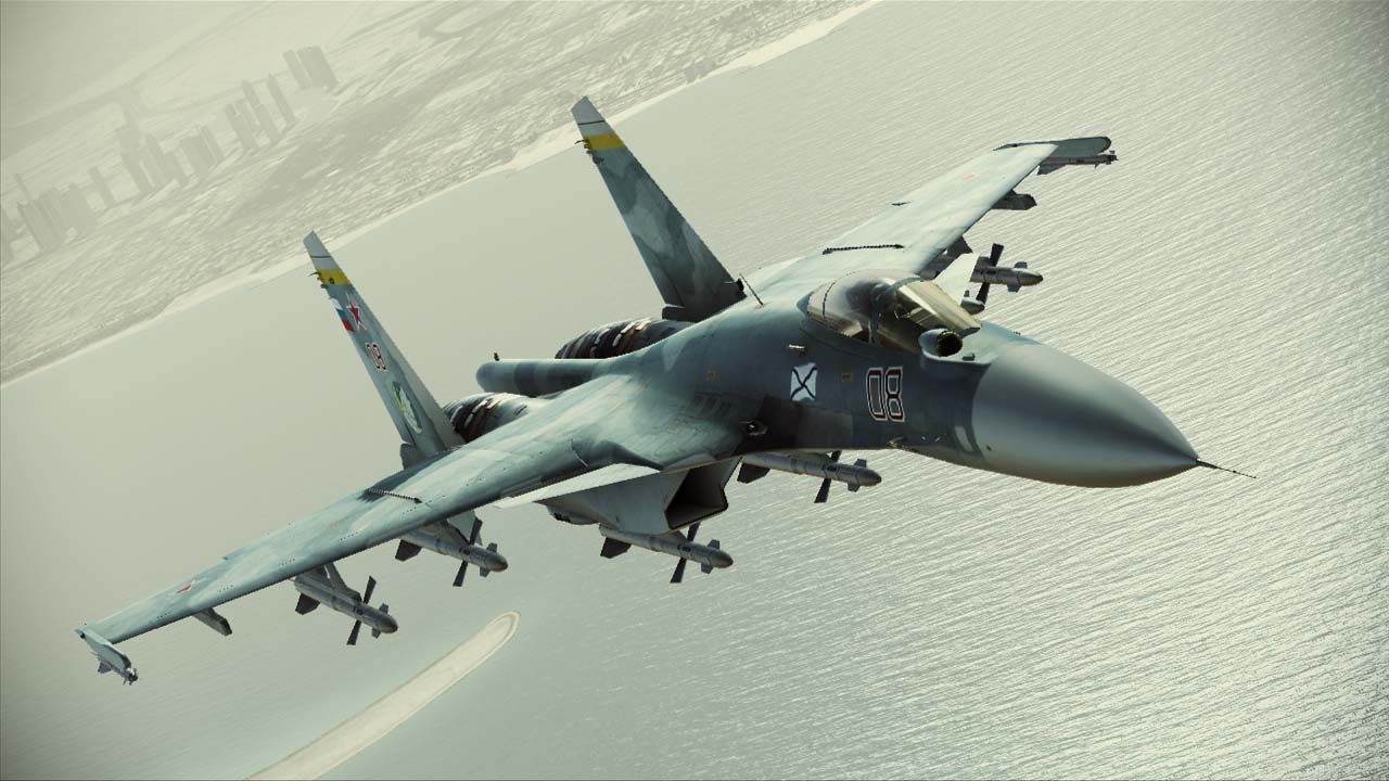 Description: A fighter jet flying over a body of water with a sky background and a city in the background with a few clouds.