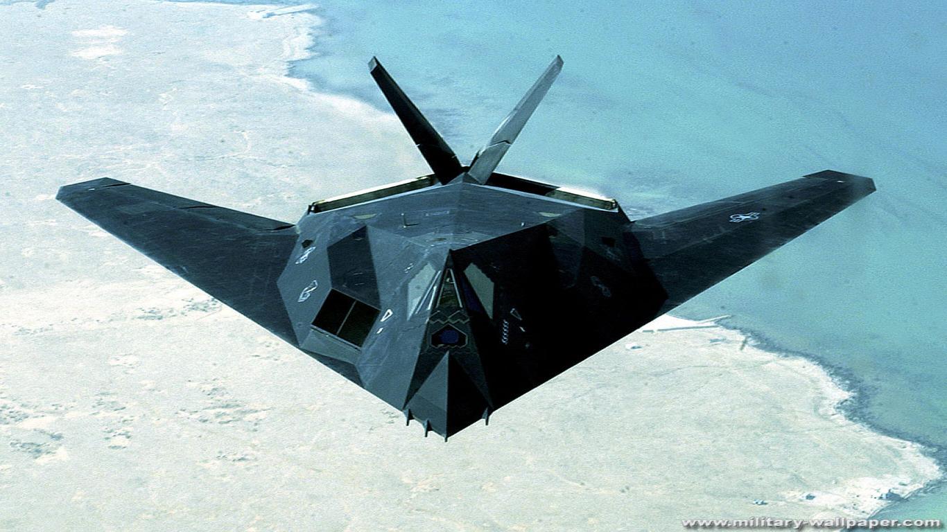 Description: A fighter jet flying over a body of water in the sky above the ocean and land below it is a blue sky.