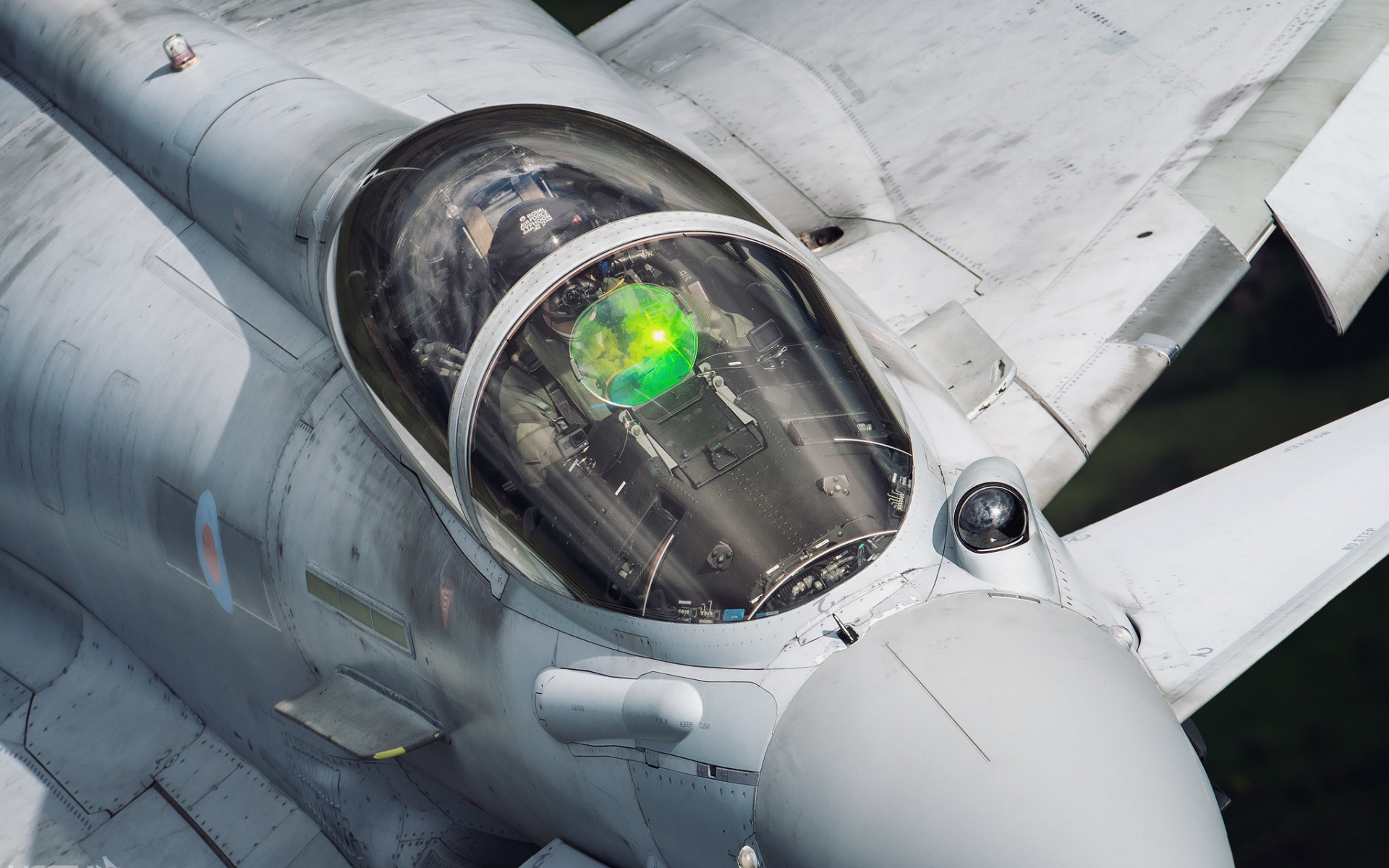 Description: A fighter jet with a green light on the cockpit window and a green light on the cockpit window of the jet.