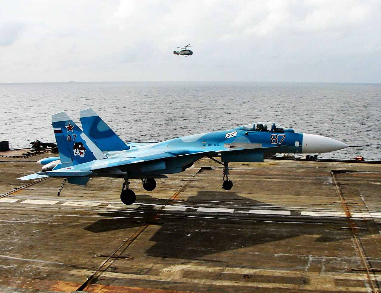 Description: A fighter jet is on a landing strip near the water and a helicopter is in the air above it.