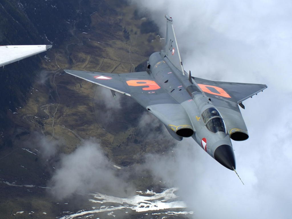 Description: A fighter jet flying through the air over a mountain range in the clouds and snow below it is a wing of a plane.