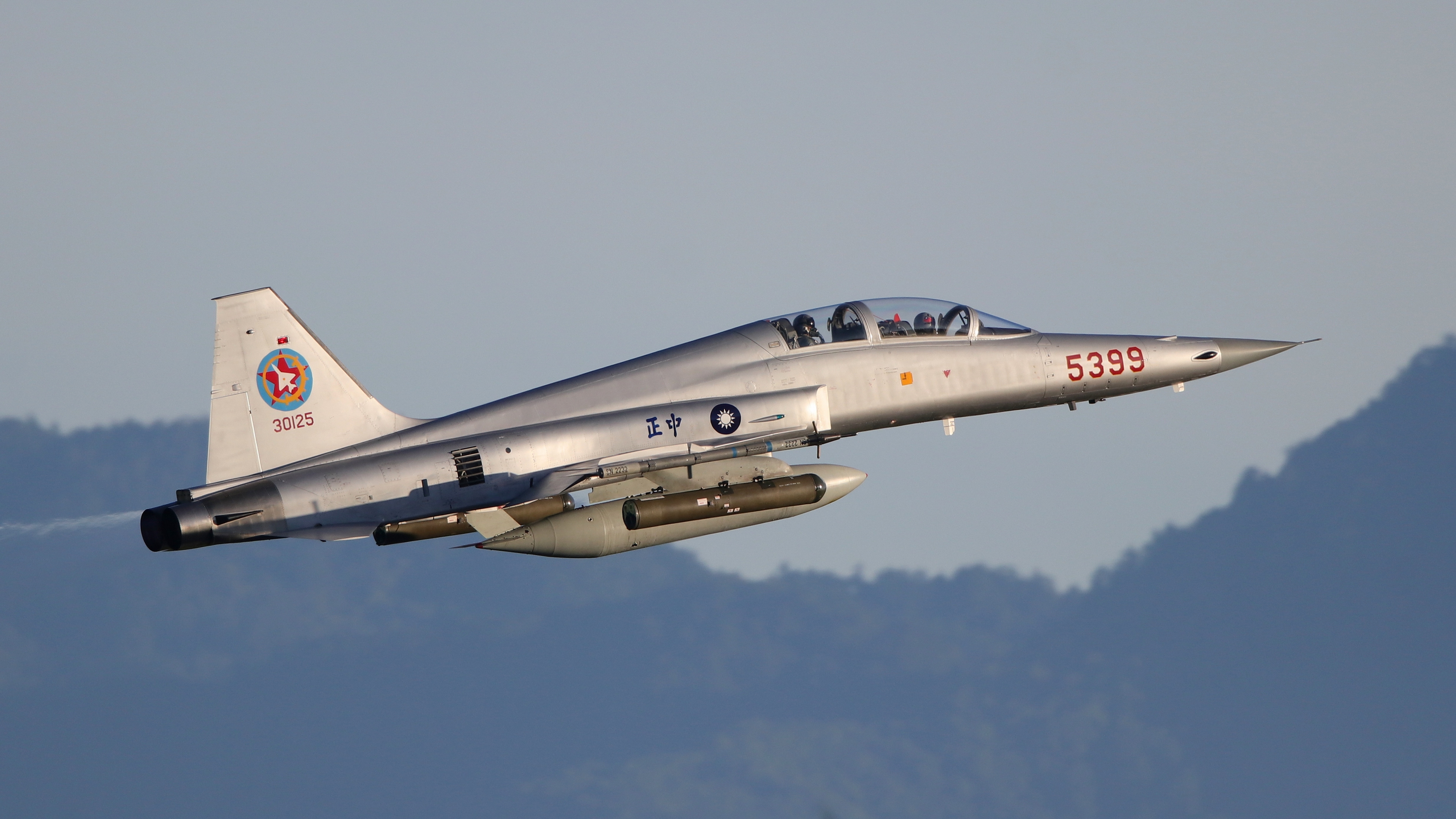 Description: A fighter jet flying through the air with mountains in the background at dusk time.