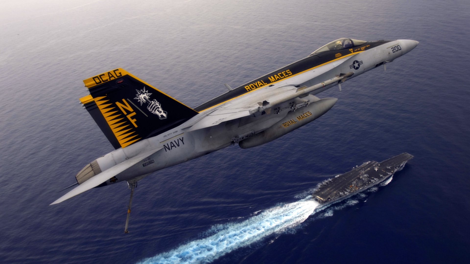 Description: A fighter jet flying over a navy ship in the ocean next to a smaller aircraft in the water with a smaller one.