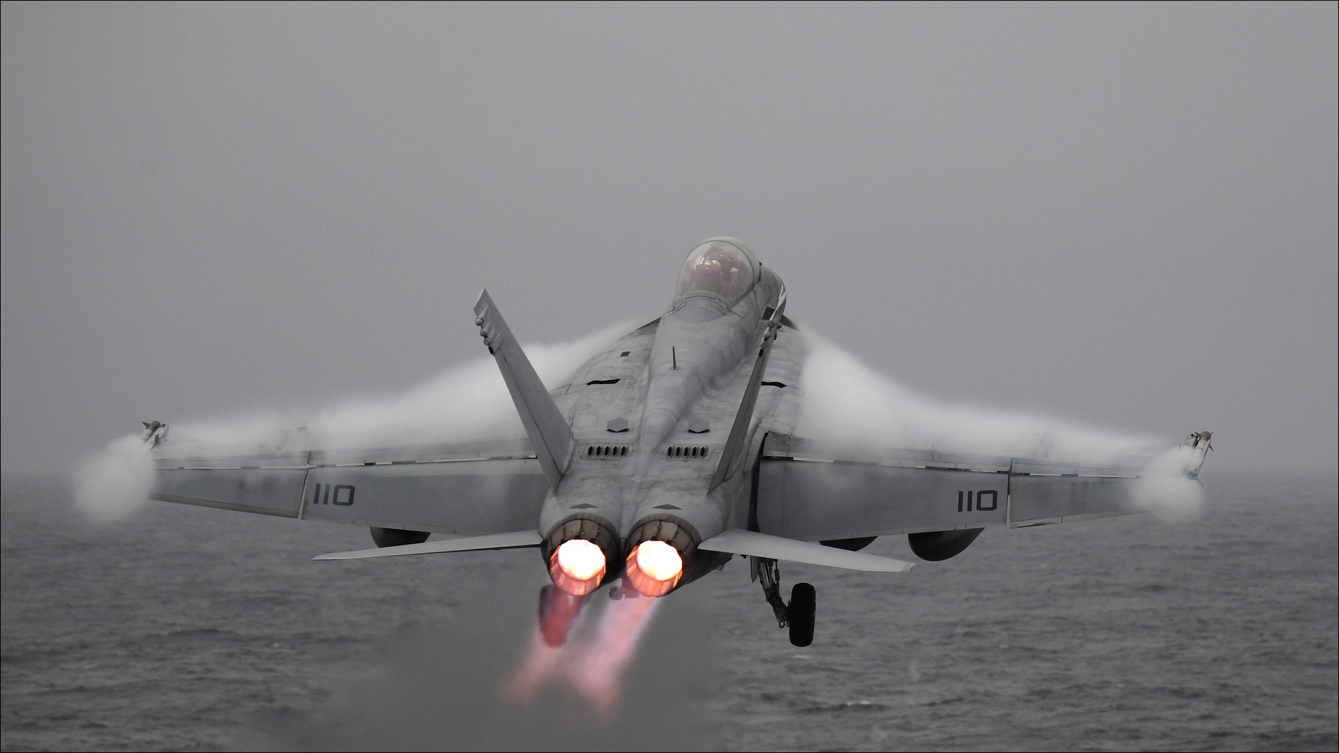 Description: A fighter jet flying over the ocean on a foggy day with red lights on it's wings.