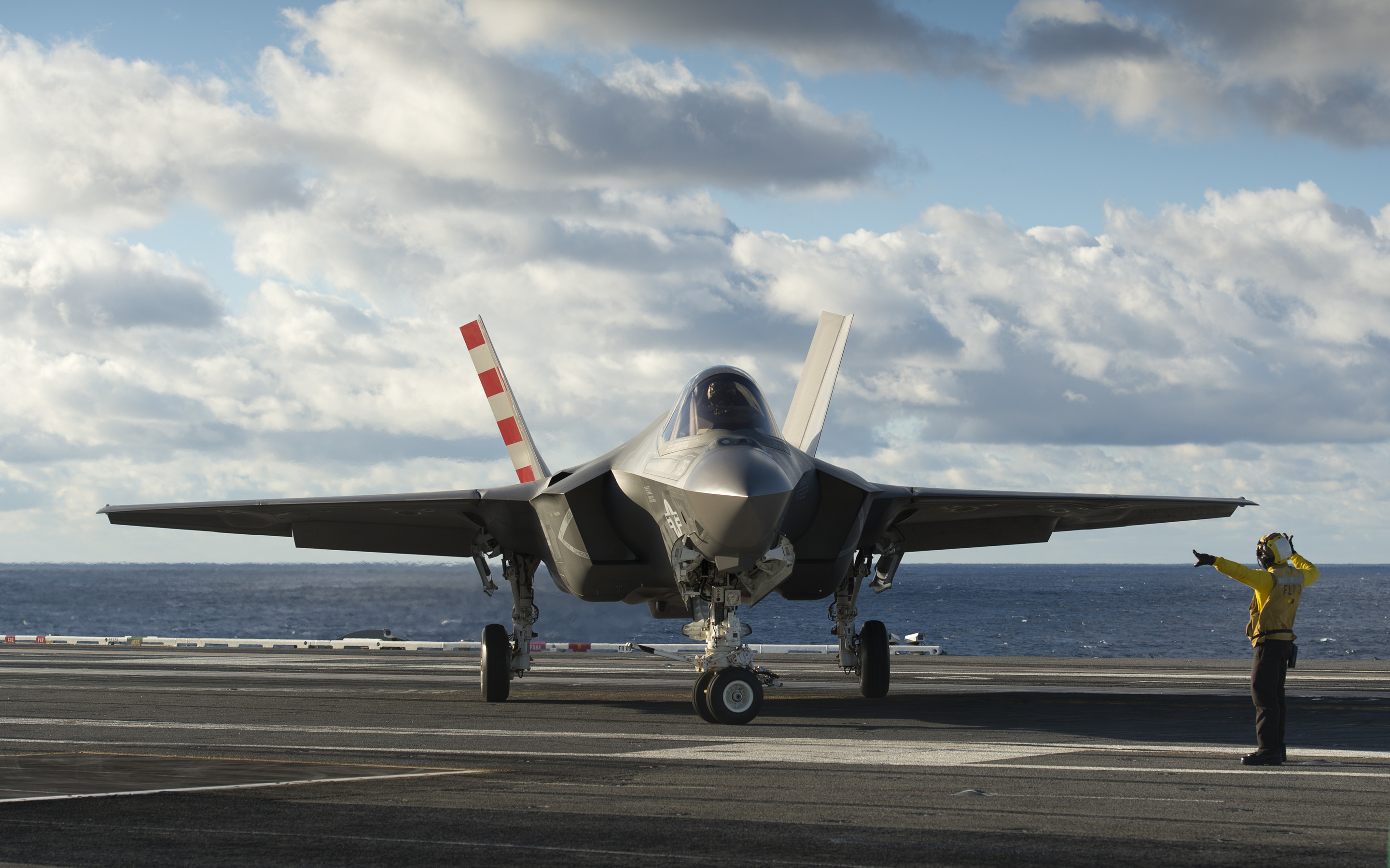Description: A fighter jet sitting on top of an airport runway next to the ocean and a man standing next to it.