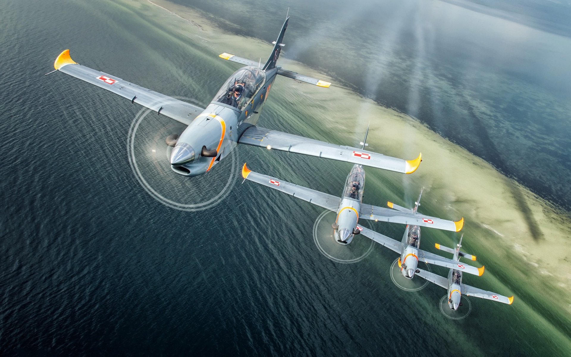 Description: A fighter jet flying over the ocean with a landing gear down and a landing gear down on the wing.