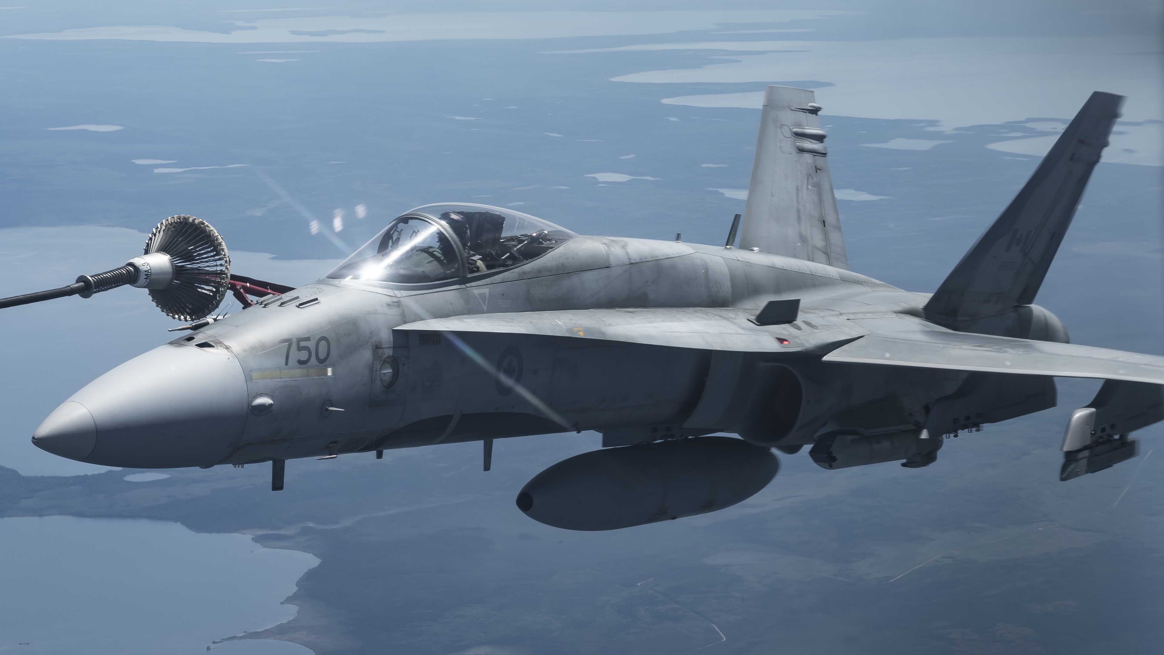 Description: A fighter jet flying through the air over water and land area with a jet engine on the wing and a pilot in the cockpit.