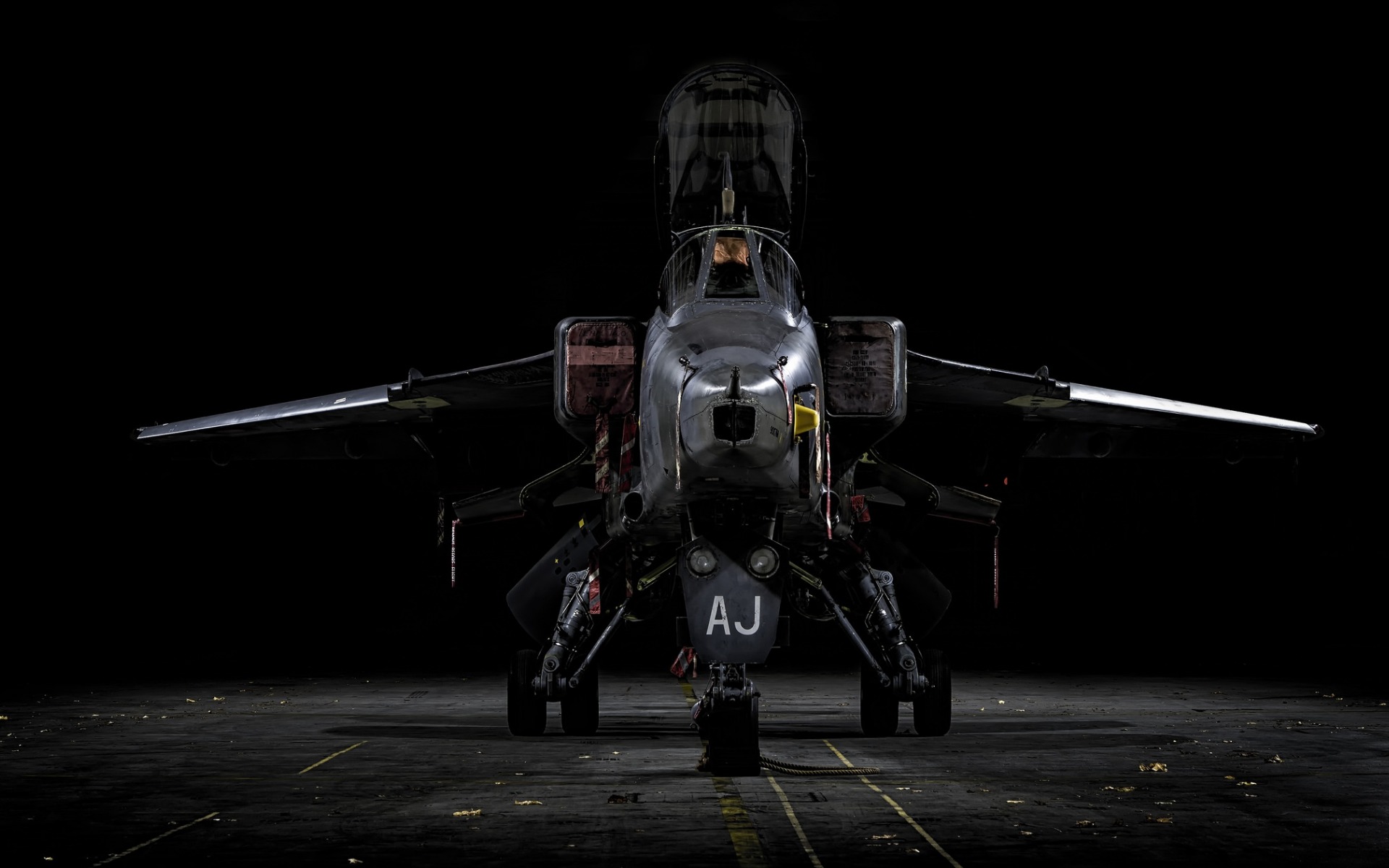 Description: A fighter jet sitting on top of a runway at night time with its lights on and the front of the plane lit up.