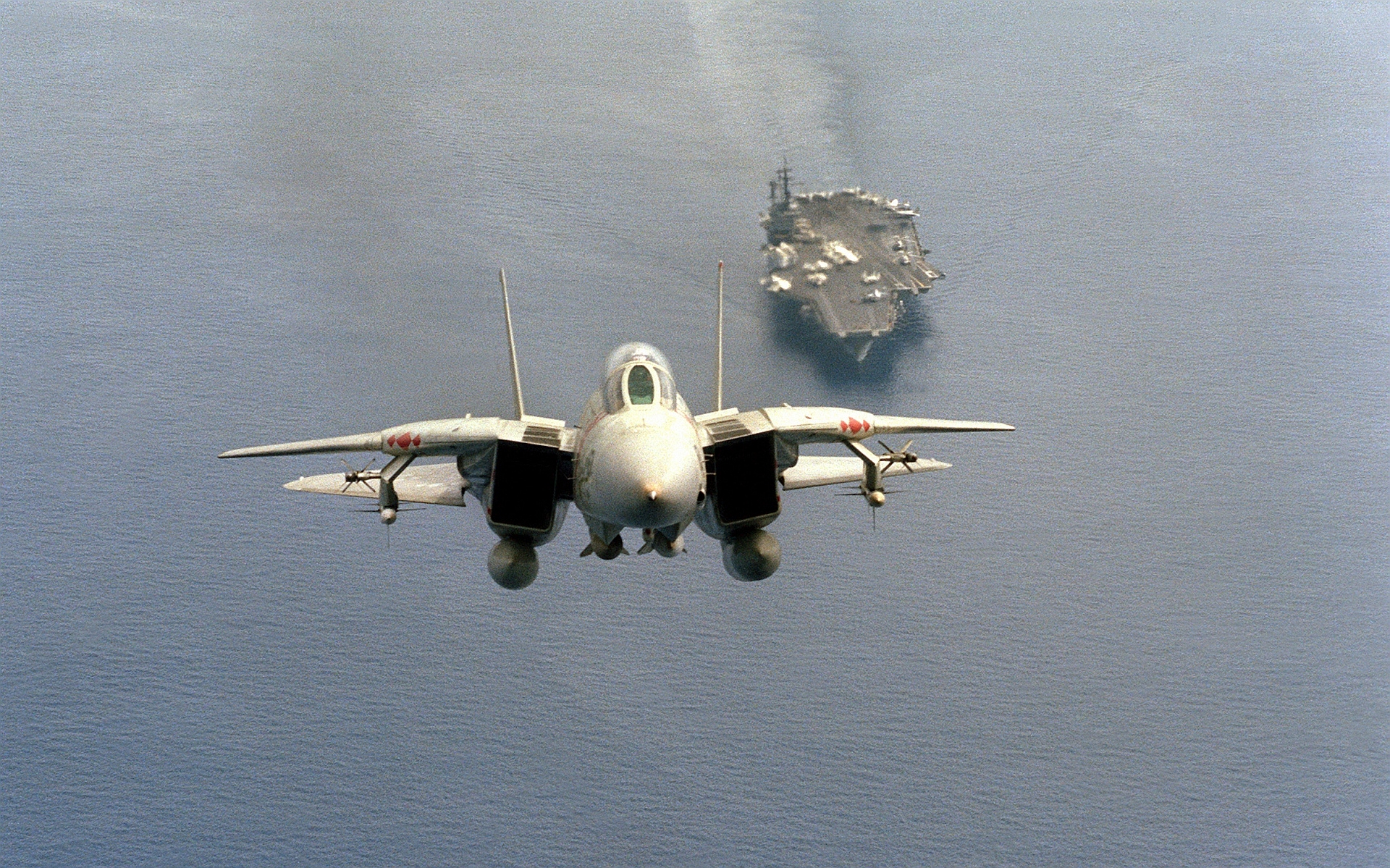 Description: A fighter jet flying over a large ship in the ocean with a smaller aircraft in the background on a cloudy day.