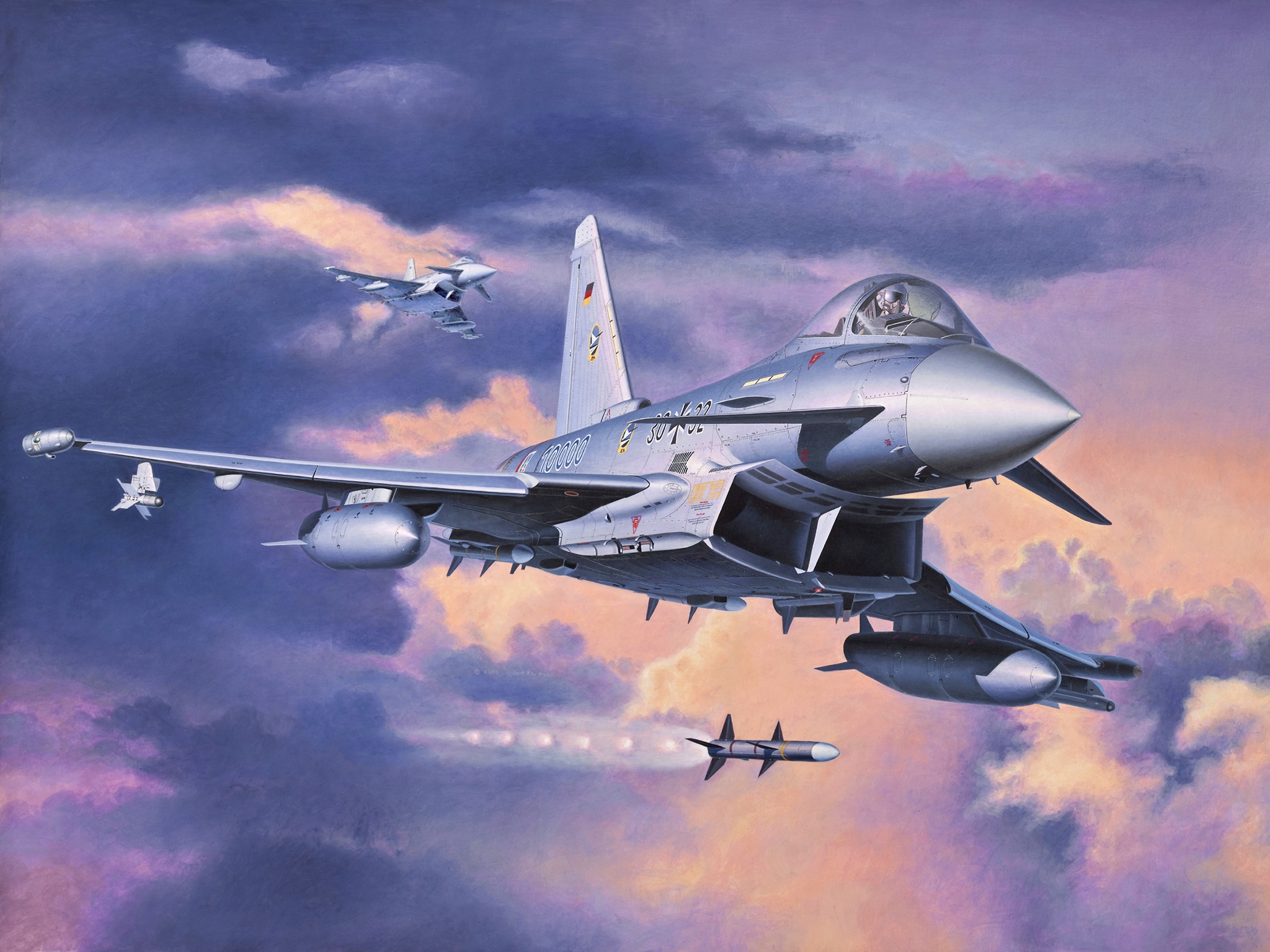 Description: A painting of a fighter jet flying through the sky with four jets below it and a jet fighter below it.