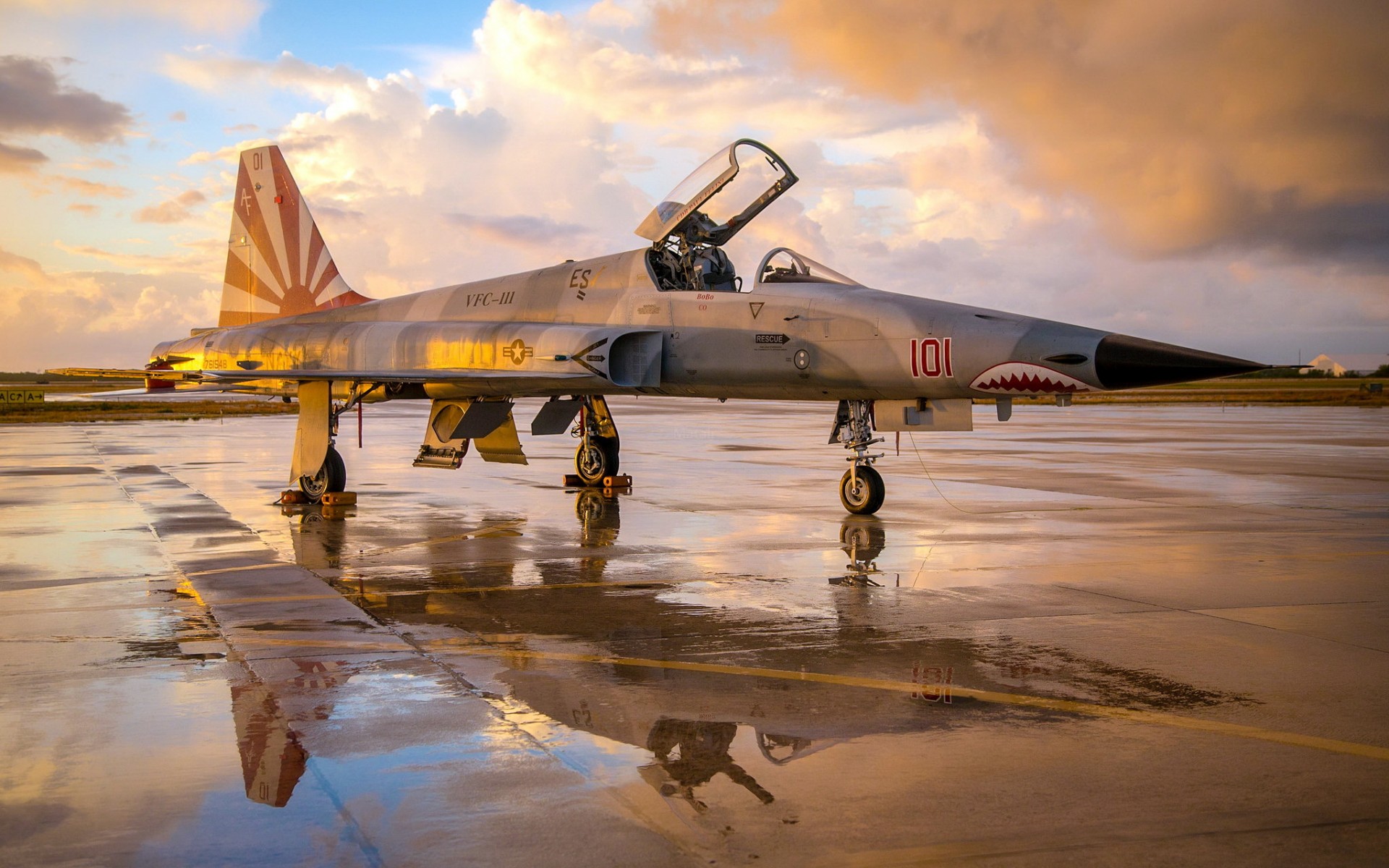 Description: A fighter jet sitting on top of an airport tarmac at sunset with clouds in the background and a reflection of the jet.