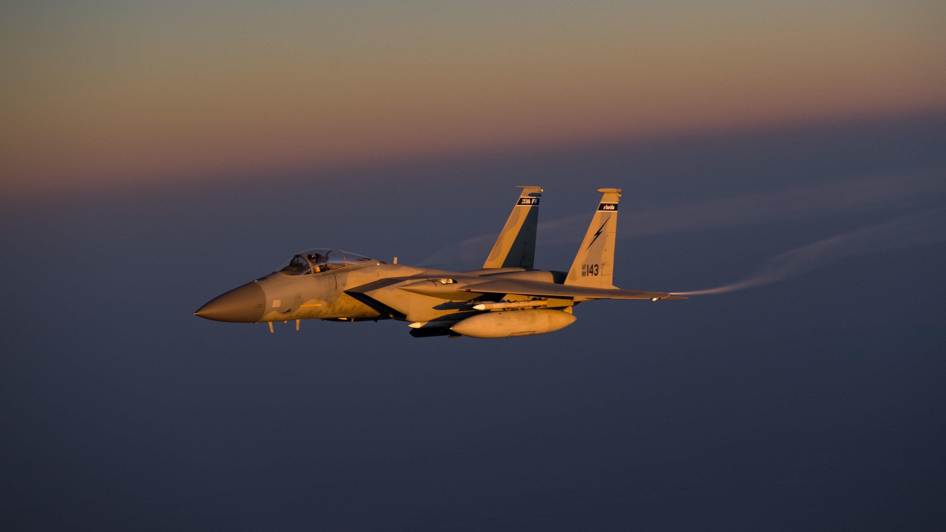Description: A fighter jet flying through the air at sunset or dawn with smoke coming out of the tail and the tail.