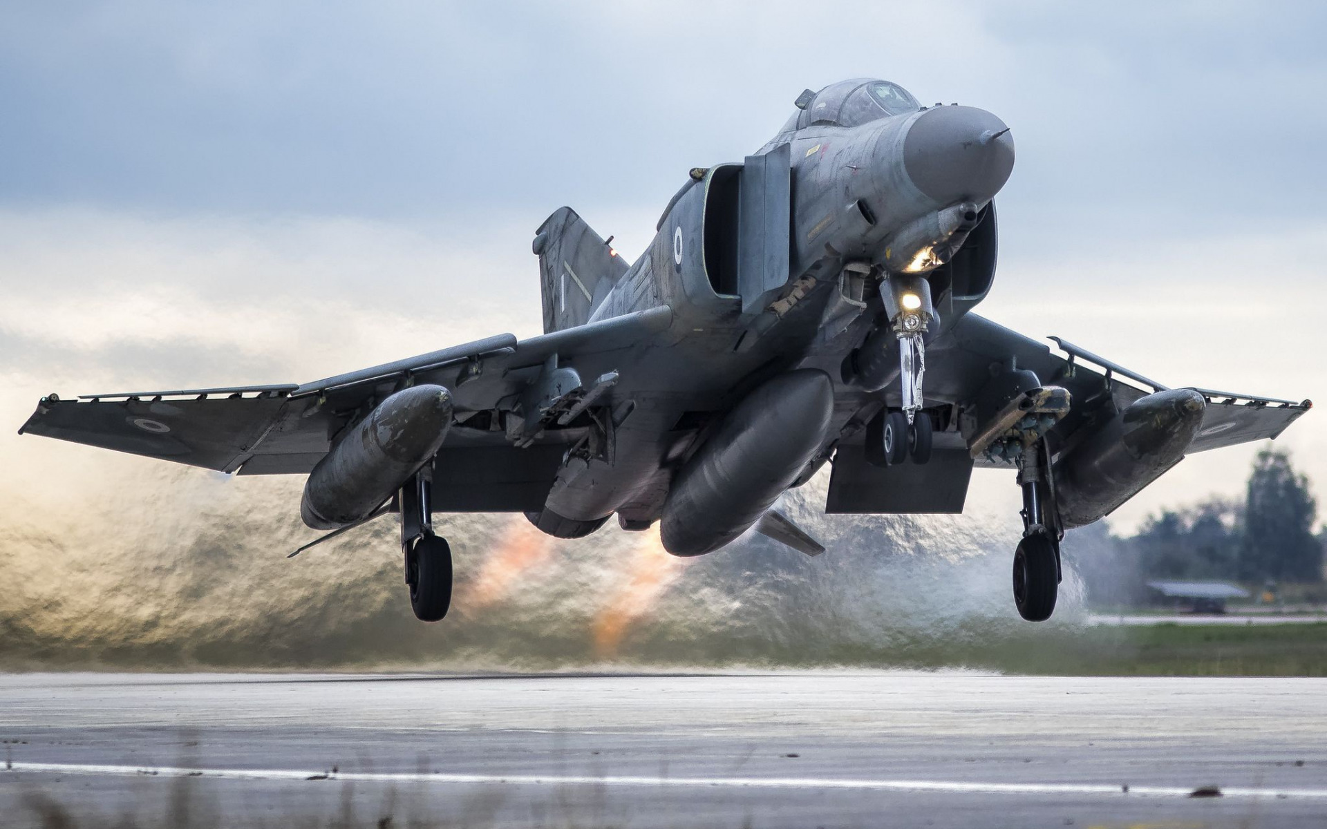 Description: A fighter jet taking off from an airport runway with smoke coming out of it's back end and landing gear on the ground.