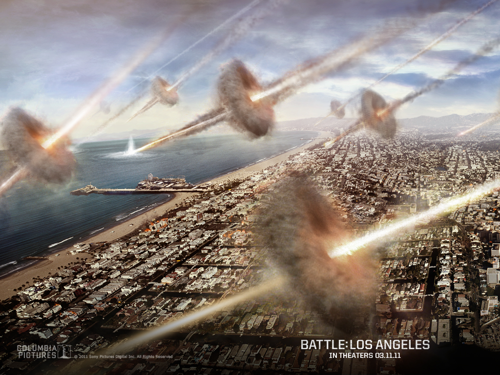 Description: A group of fighter jets flying over a city next to the ocean with a sky background and a city below.