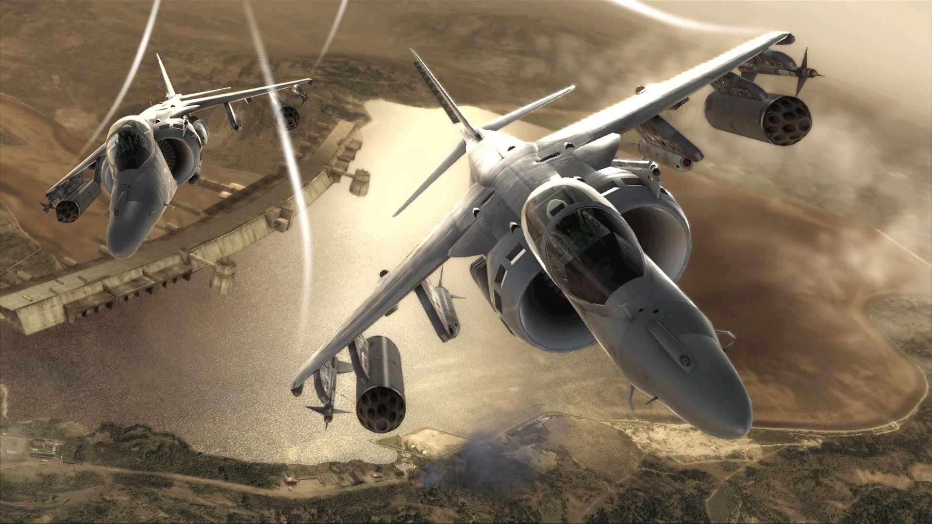 Description: Two fighter jets flying over a desert landscape in the air with smoke coming out of the wings and landing gear.