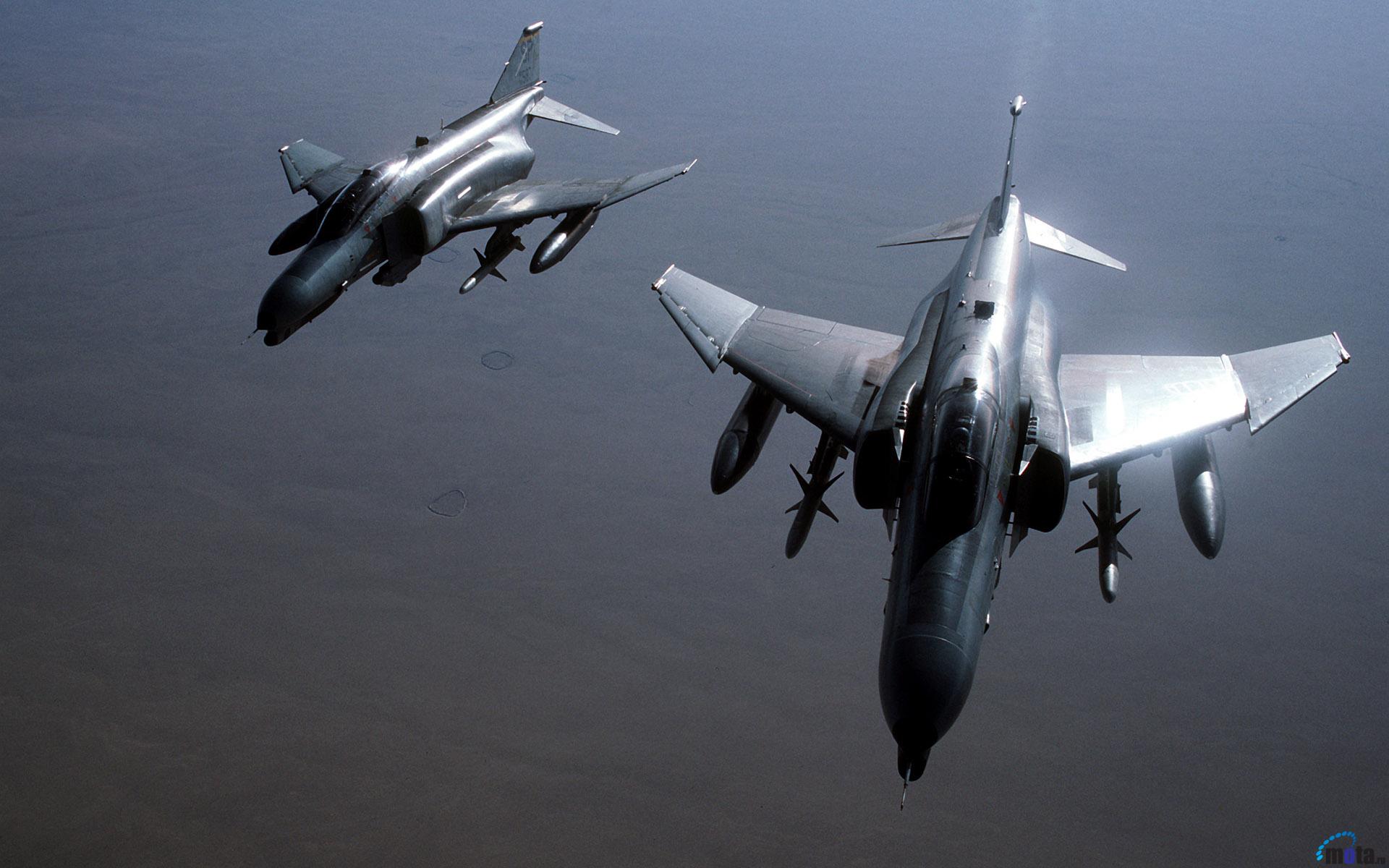 Description: Two fighter jets flying side by side in the air over water and land area with a sun shining on the ground.