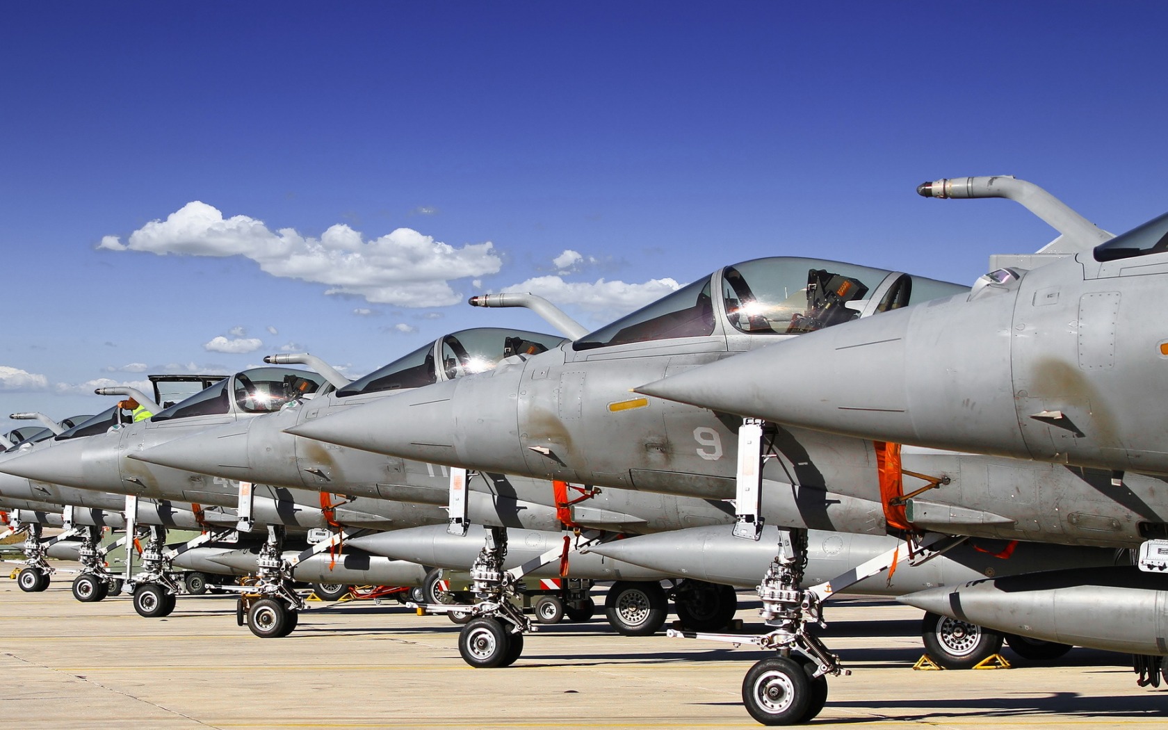 Description: A row of fighter jets sitting on top of an airport tarmac with a sky background and clouds in the background.