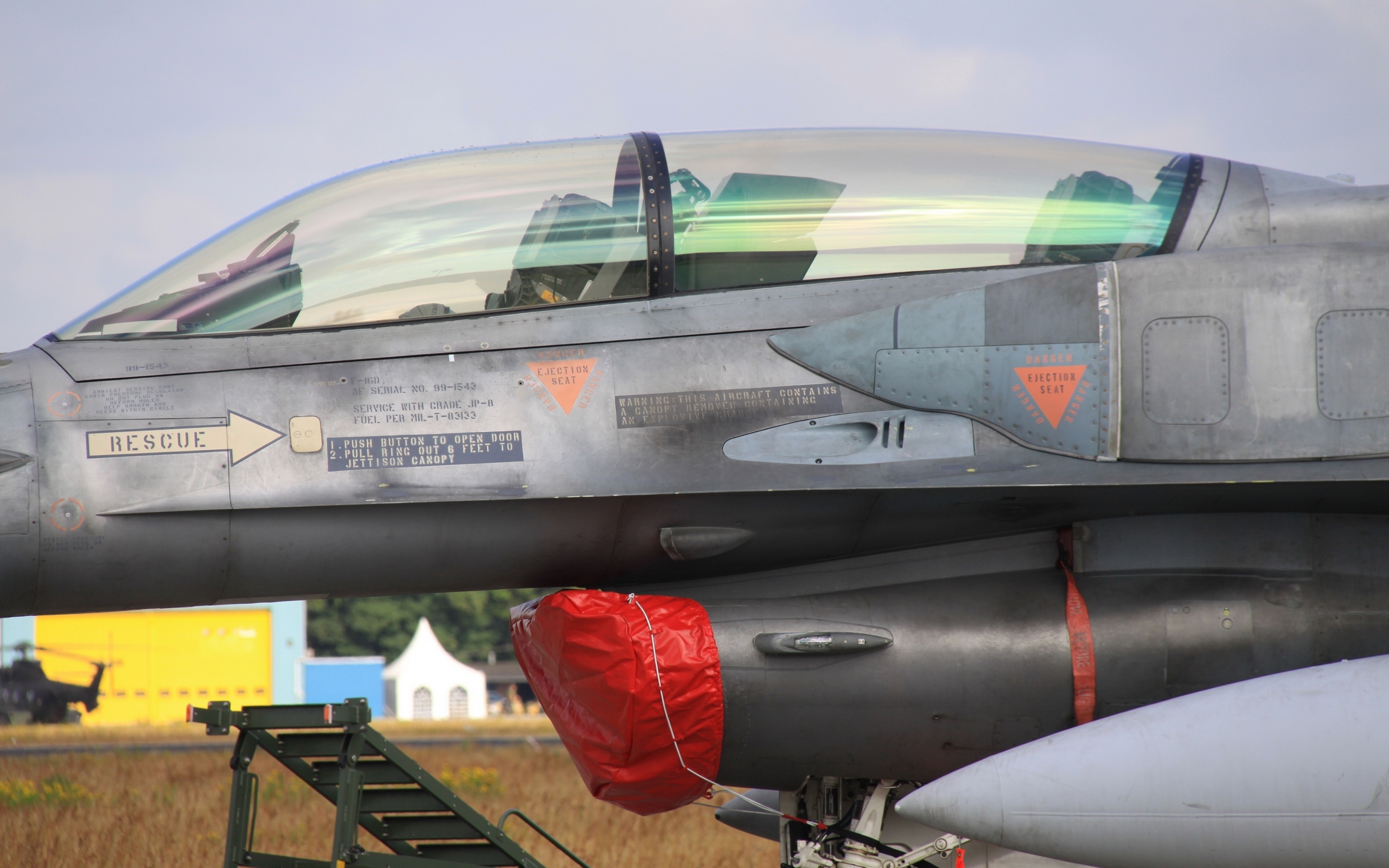 Description: A fighter jet sitting on top of a field next to a field of grass and trees with a sky background.