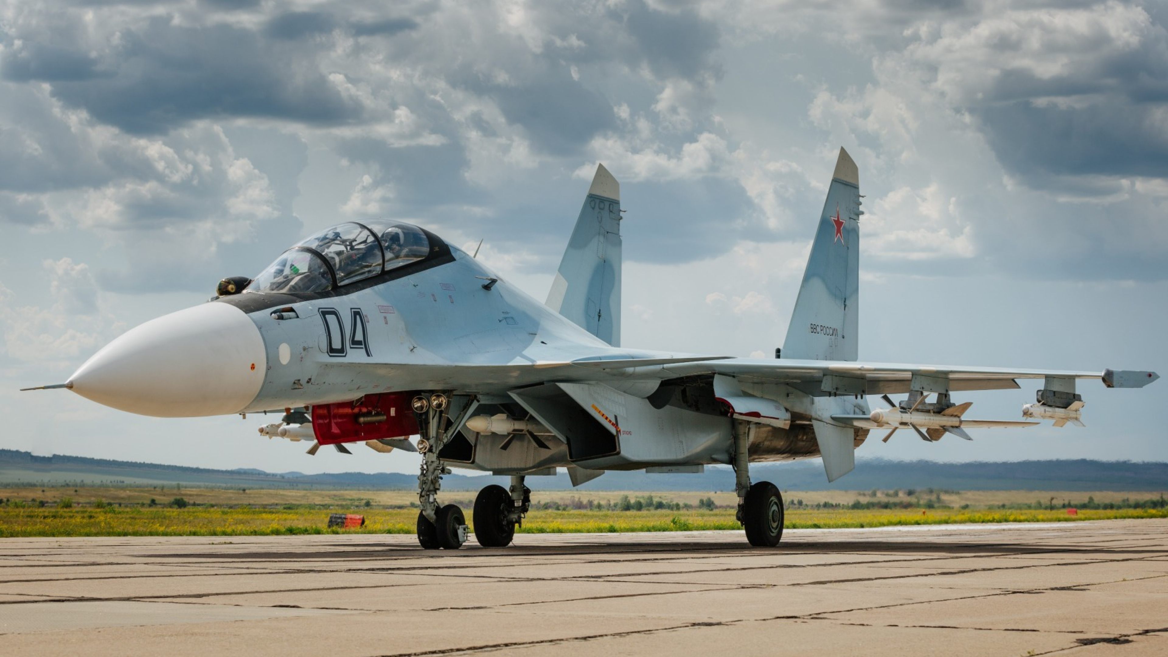 Description: A fighter jet sitting on top of an airport runway under a cloudy sky with clouds above it and a red and white stripe on the bottom of the wing.