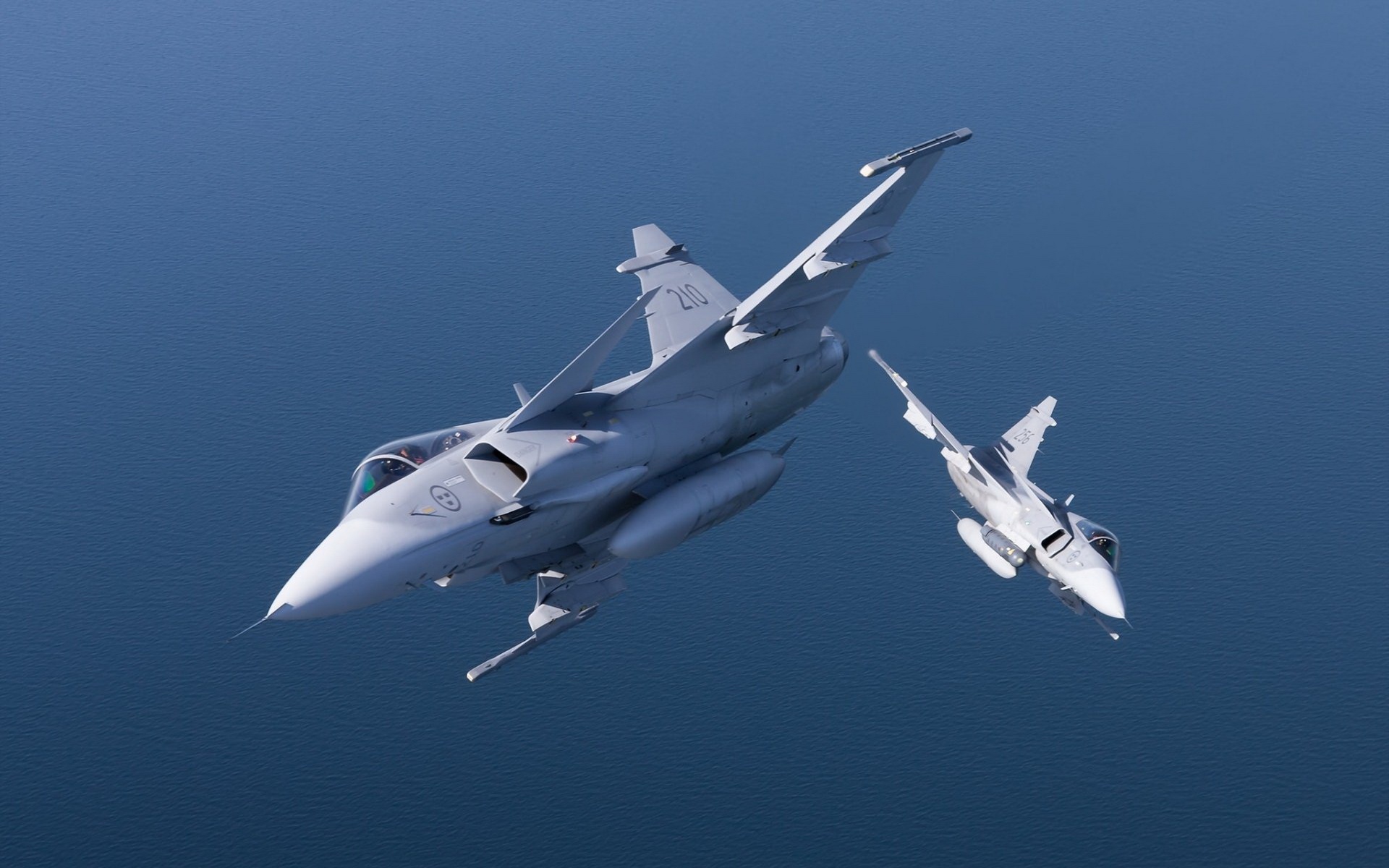 Description: Two fighter jets flying side by side in the air over the ocean and a body of water in the background.