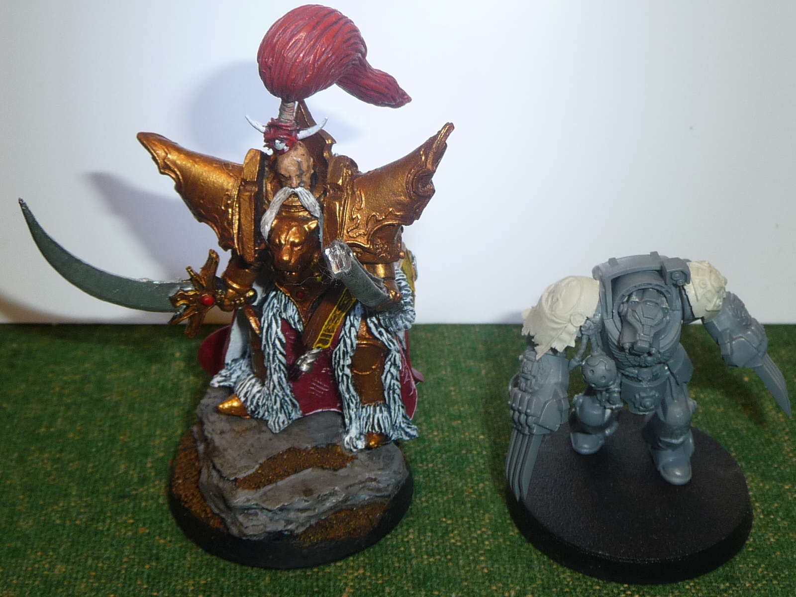 Description: Two figurines of a man with a sword and a demon on a rock and a statue of a man with a sword.