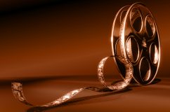Description: A film reel with a shiny gold ribbon on it's side and a brown background behind it.