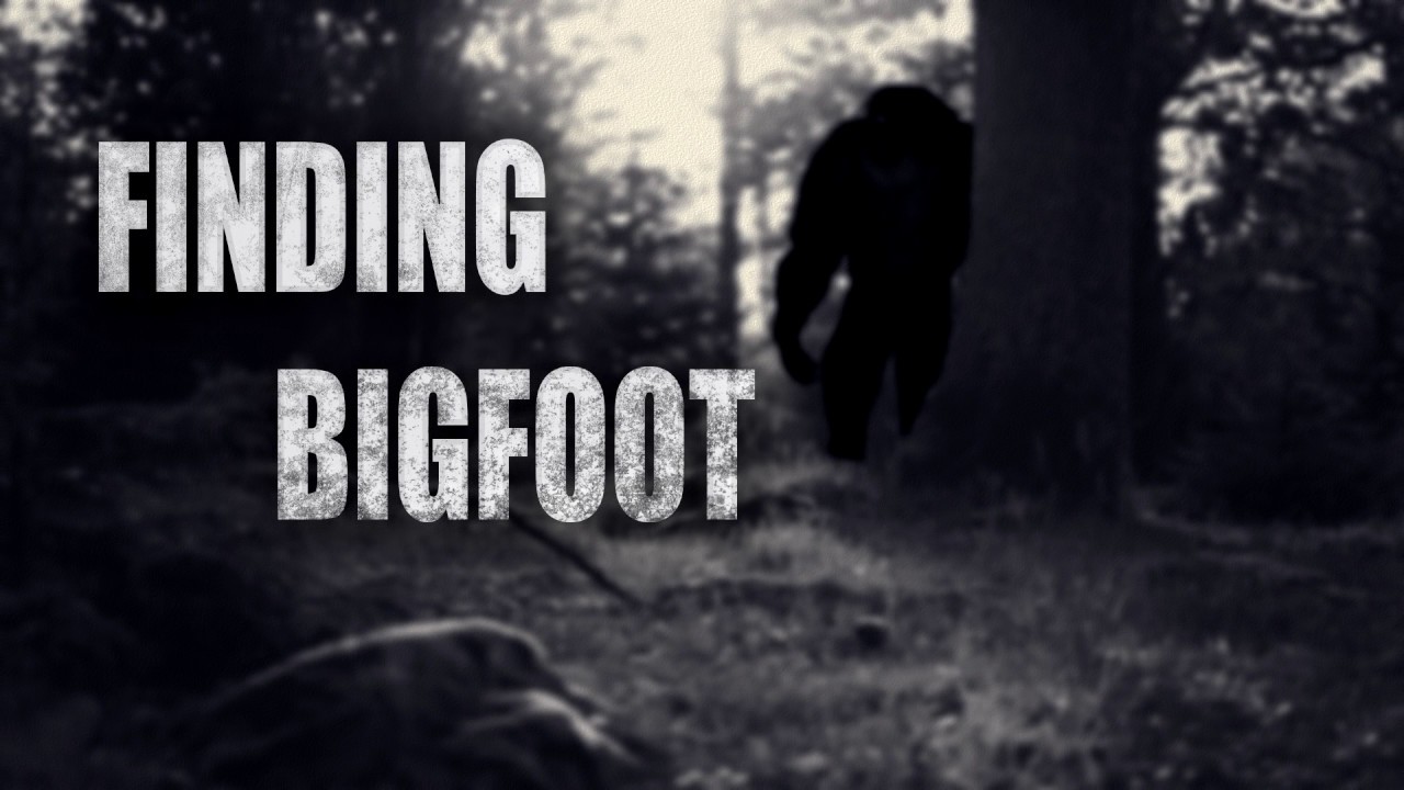 Description: A black and white photo of a bigfoot in the woods with the words finding bigfoot in the background.