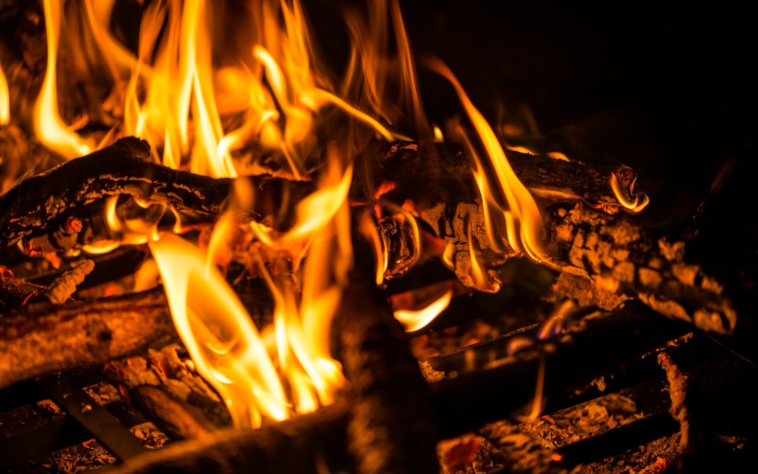 Description: A fire burning in a fireplace with lots of flames and bright yellow flames on the flames and wood in the fire.