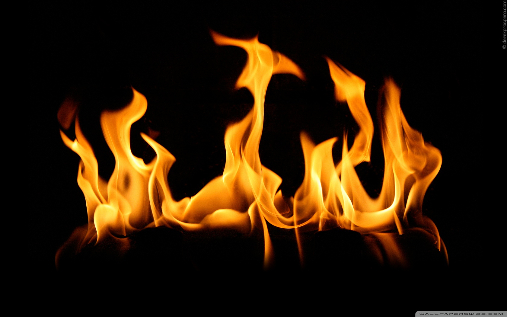 Description: A close up of a fire with many flames in it's center and a black background with a black background.