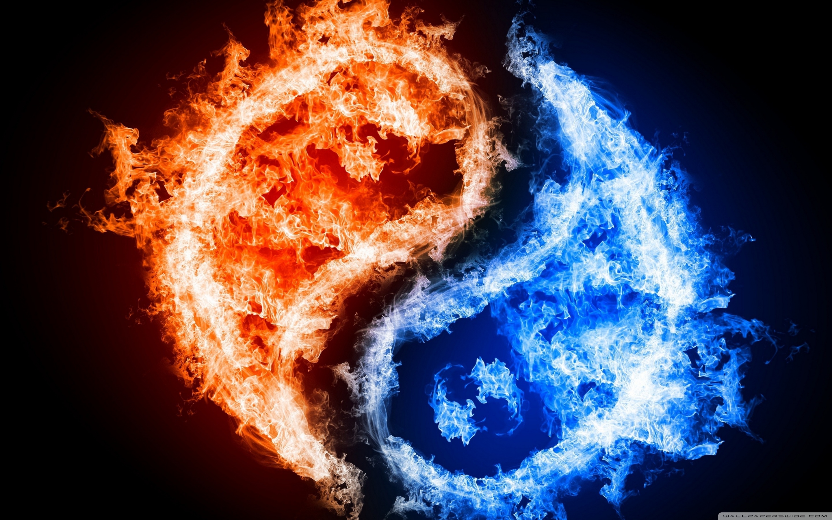 Description: A fire and ice yin - yang symbol on a black background with a blue flame in the middle of the image.