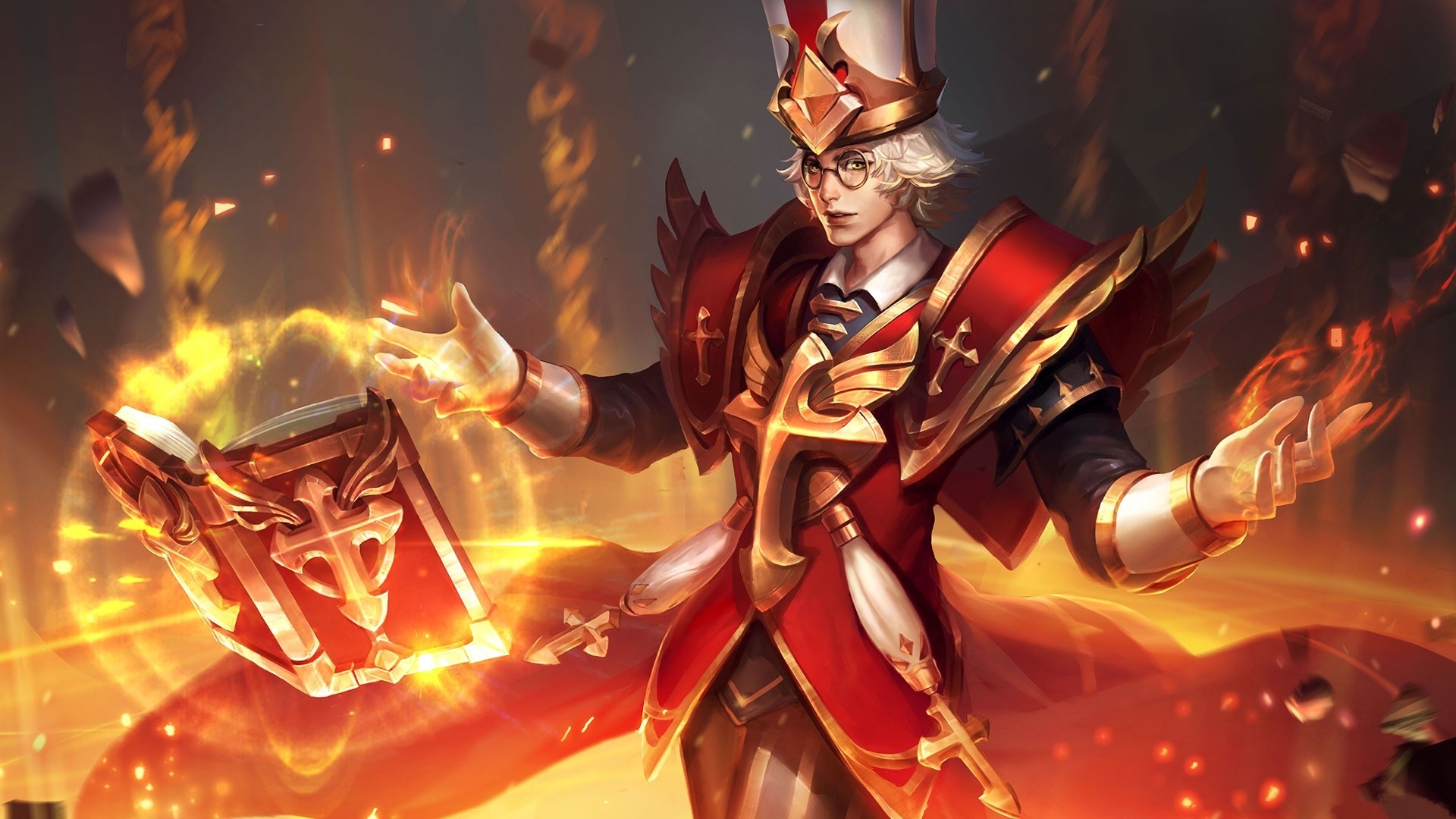 Description: A man in a red and gold outfit holding a box of fire and a sword in his hand and a flame behind him.