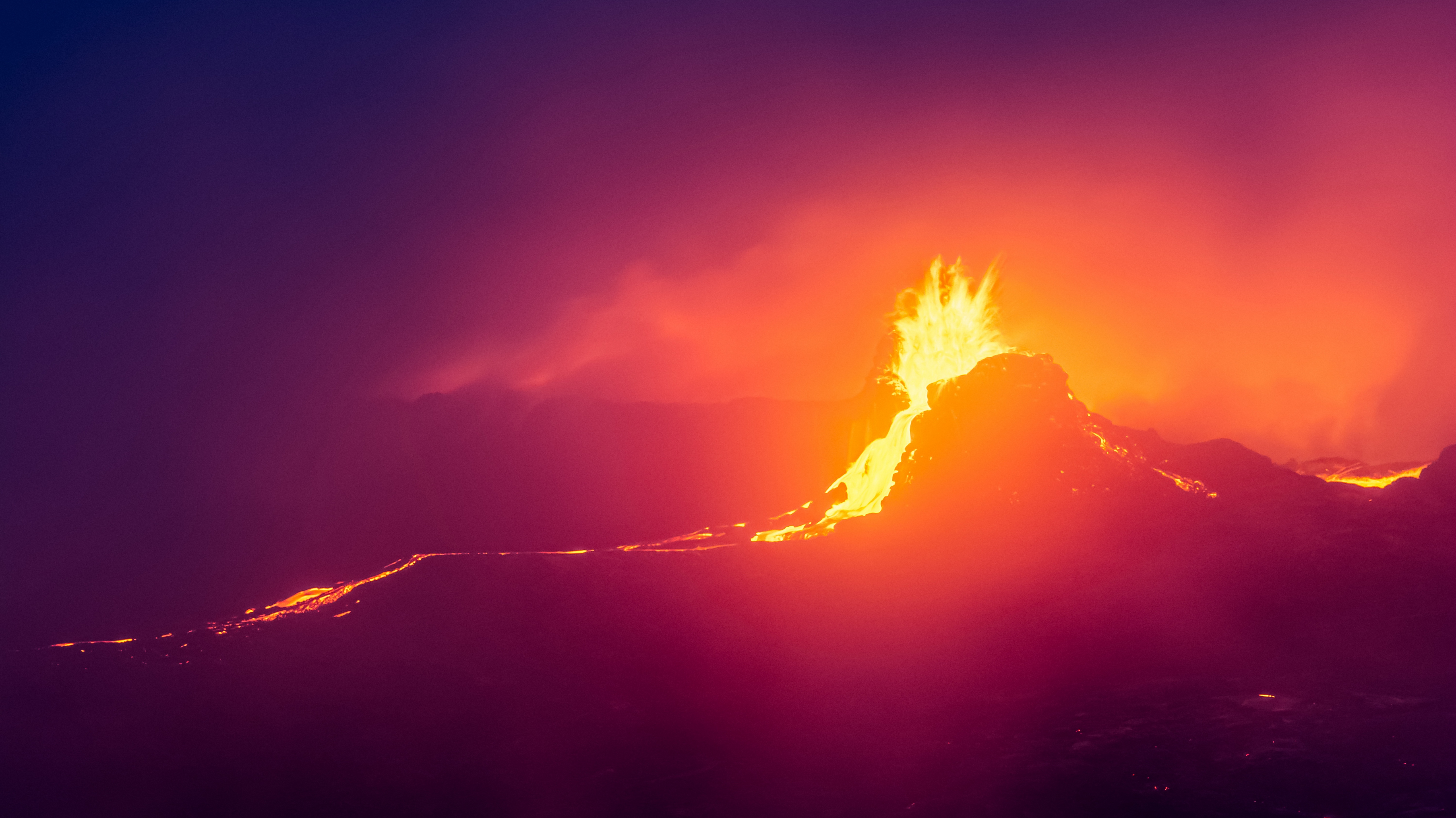 Description: A bright orange and red fire is rising from a mountain peak in the sky with a dark background and a bright red light is shining on the top of the mountain.