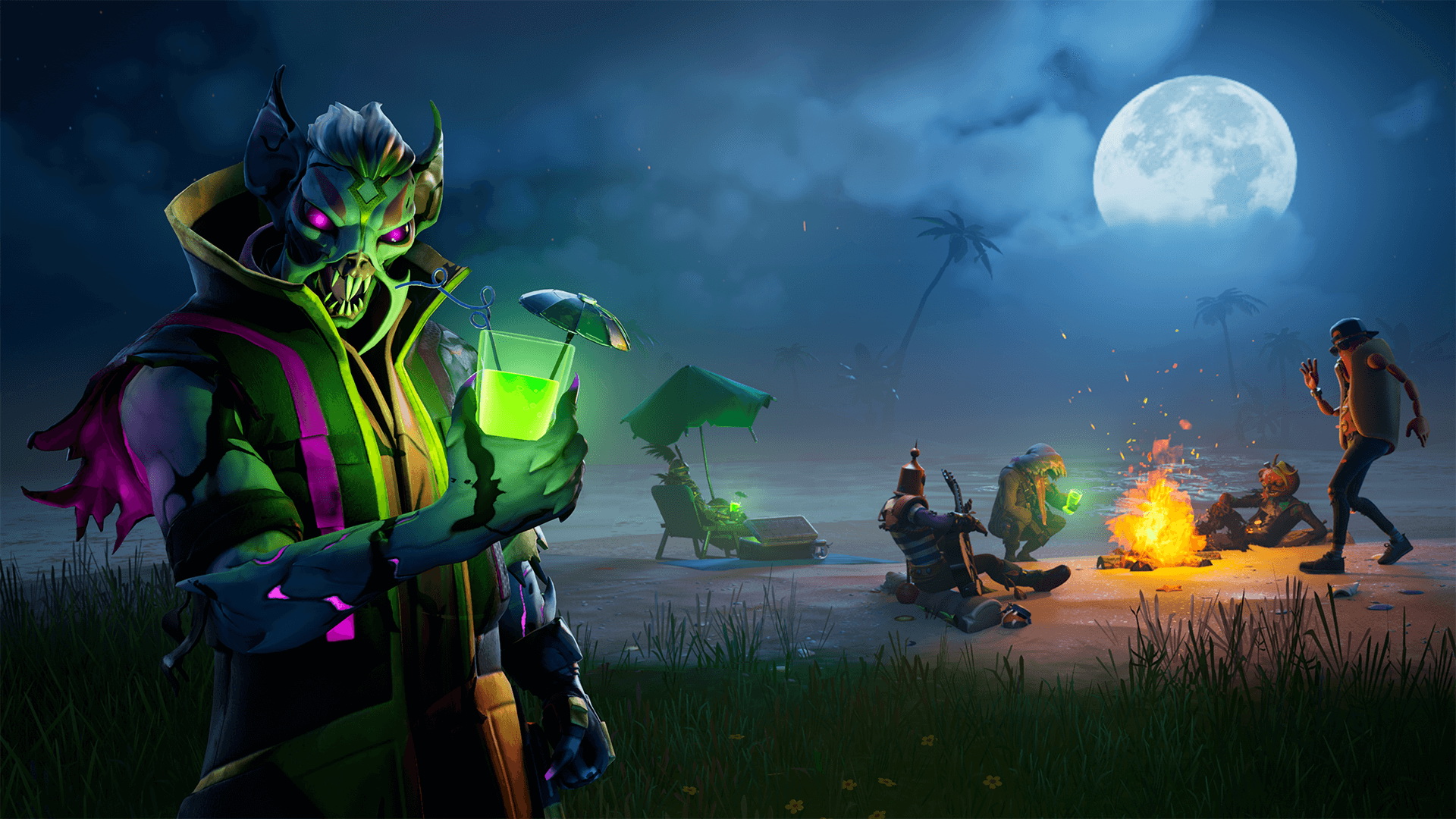 Description: A group of people standing around a fire in a field at night with a full moon in the background.