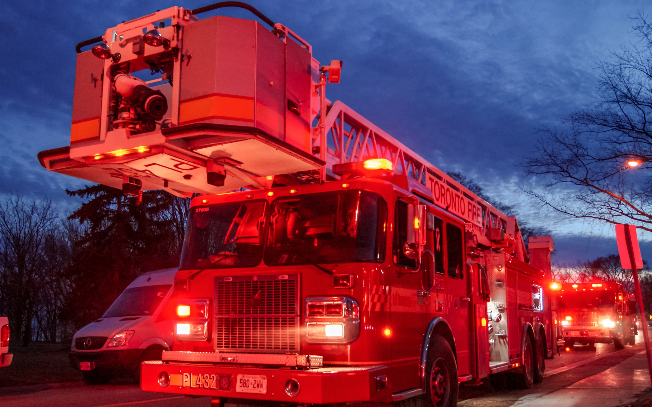 Description: A fire truck parked on the side of the road at night with its lights on and a ladder on top.