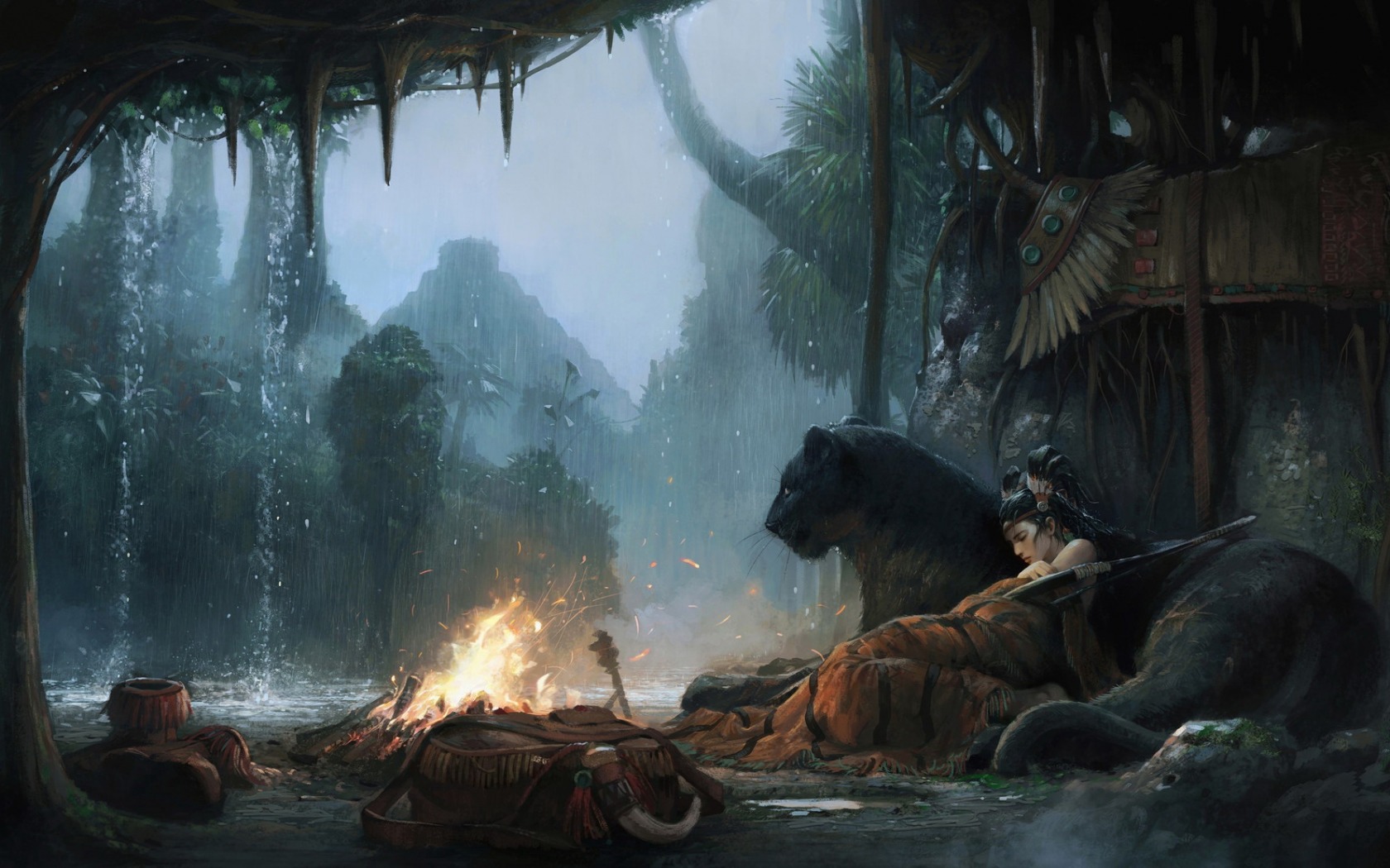 Description: A painting of a man and a woman sitting by a fire in a forest with a bear and a woman sitting on a log.
