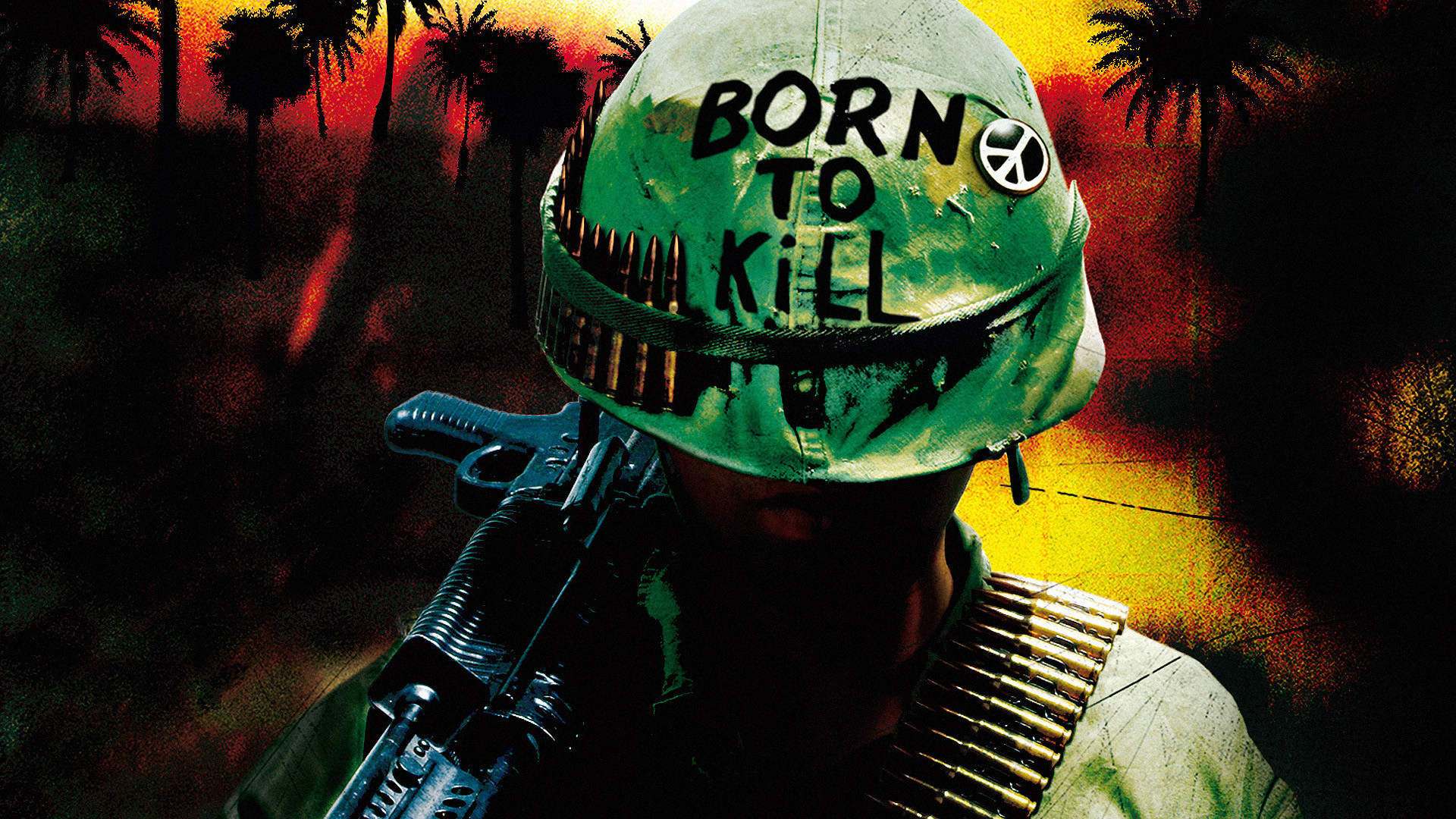 Description: A man in a fireman's helmet holding a gun in front of a painting of palm trees.