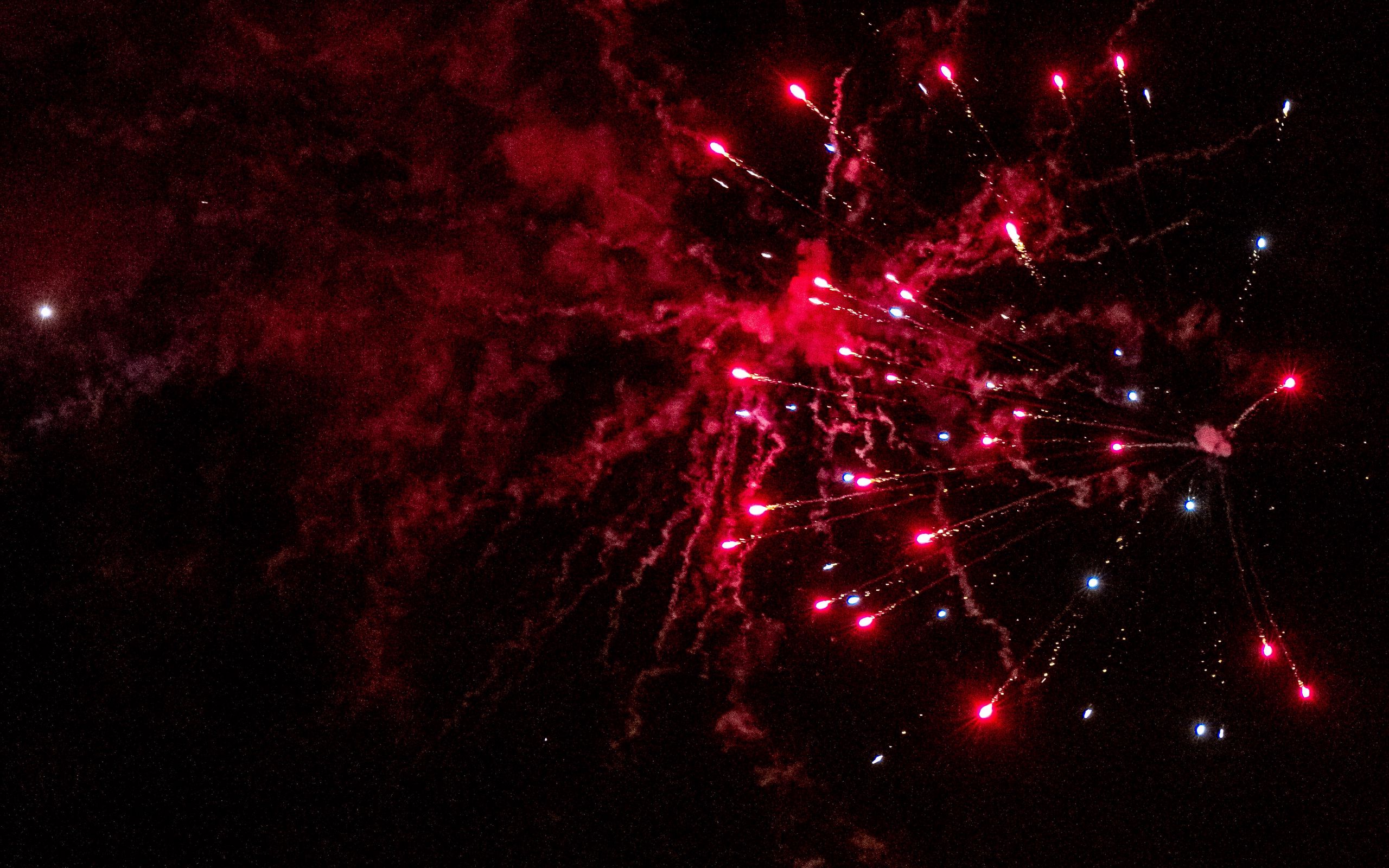 Description: A red fireworks is lit up in the night sky with red and blue lights on it's side.