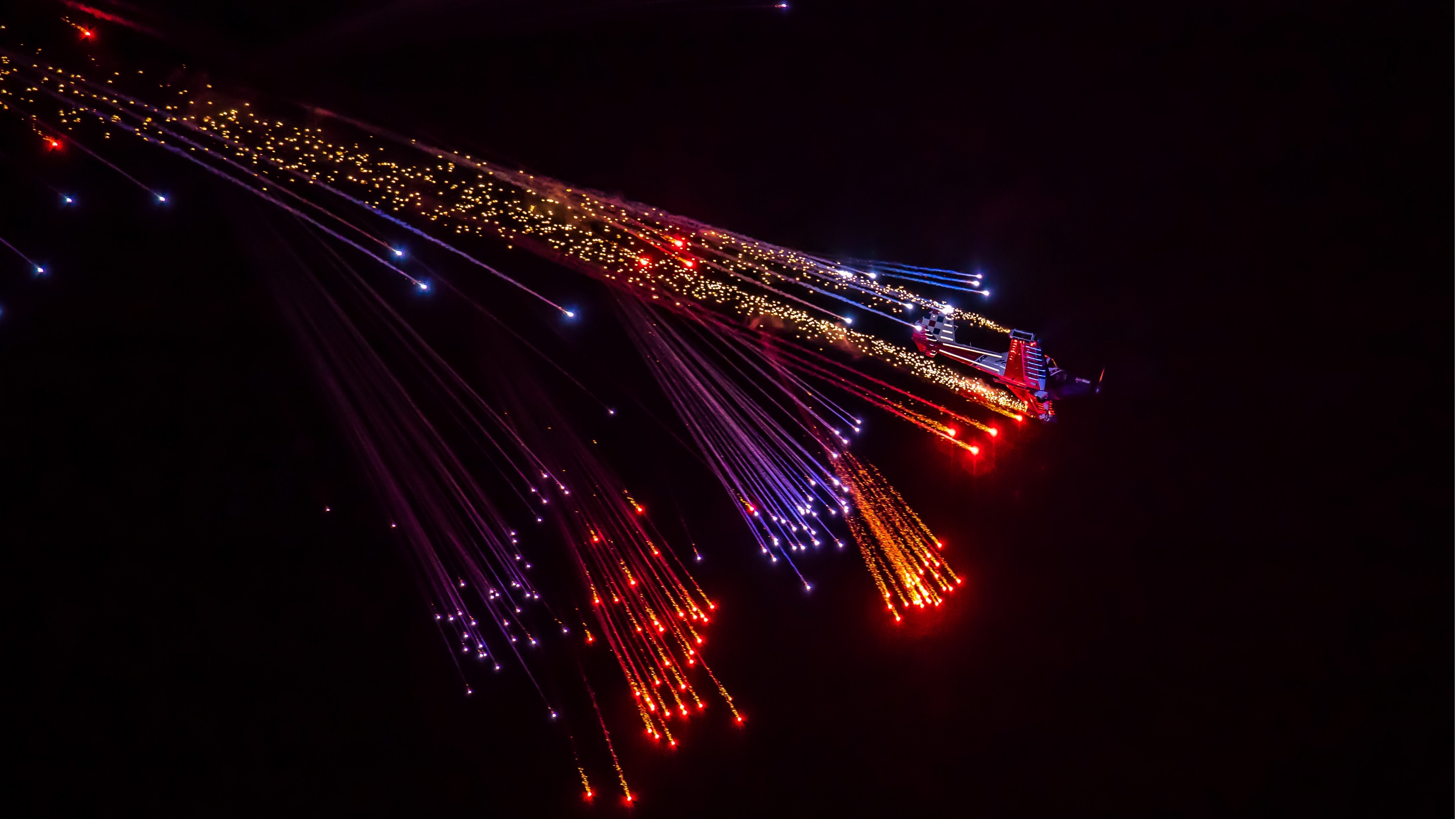 Description: A long exposure of fireworks in the dark sky at night time with a long exposure of fireworks in the dark sky.