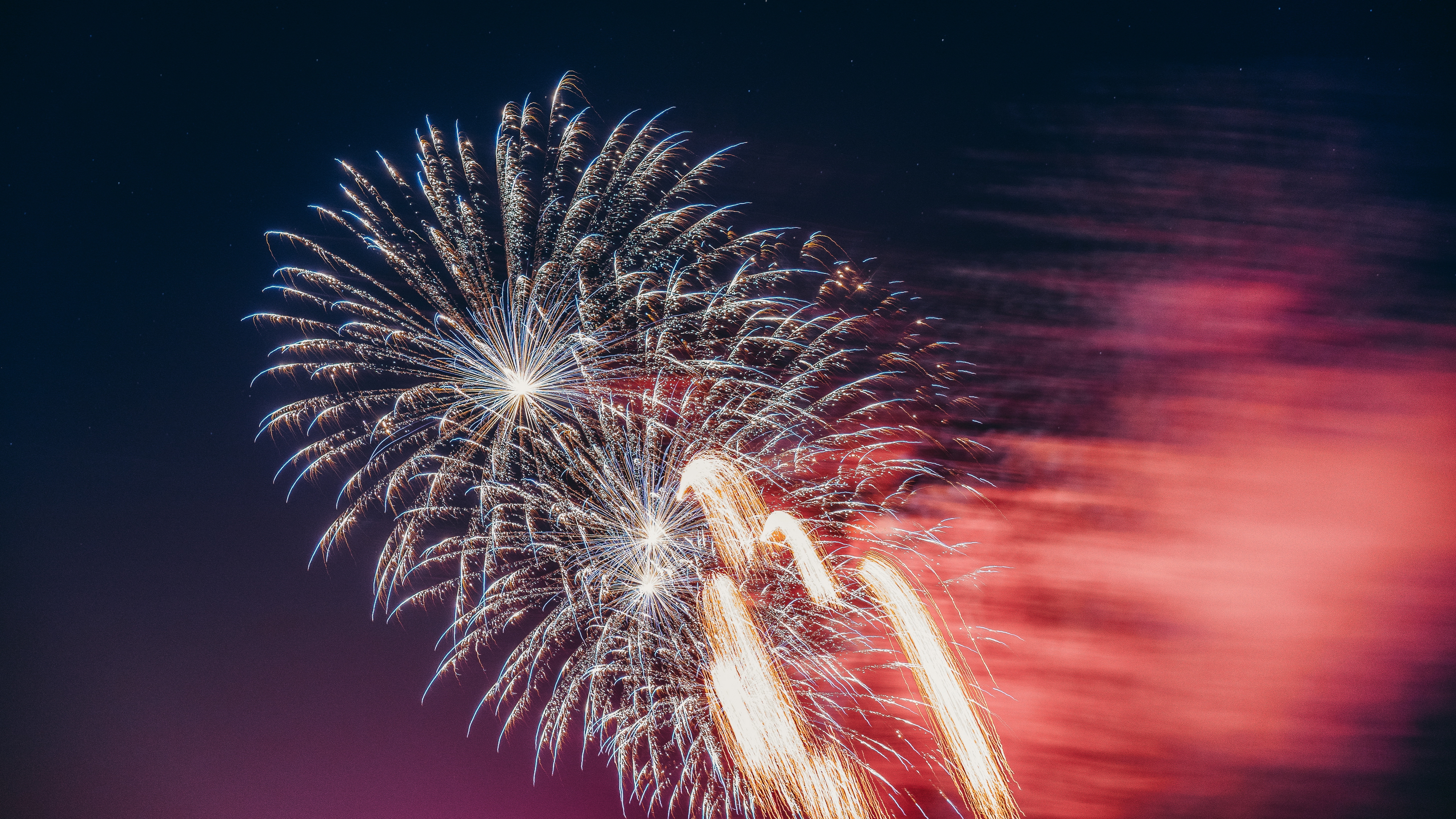 Description: A fireworks display with a sky background and a red sky in the background with clouds and a red and blue sky.