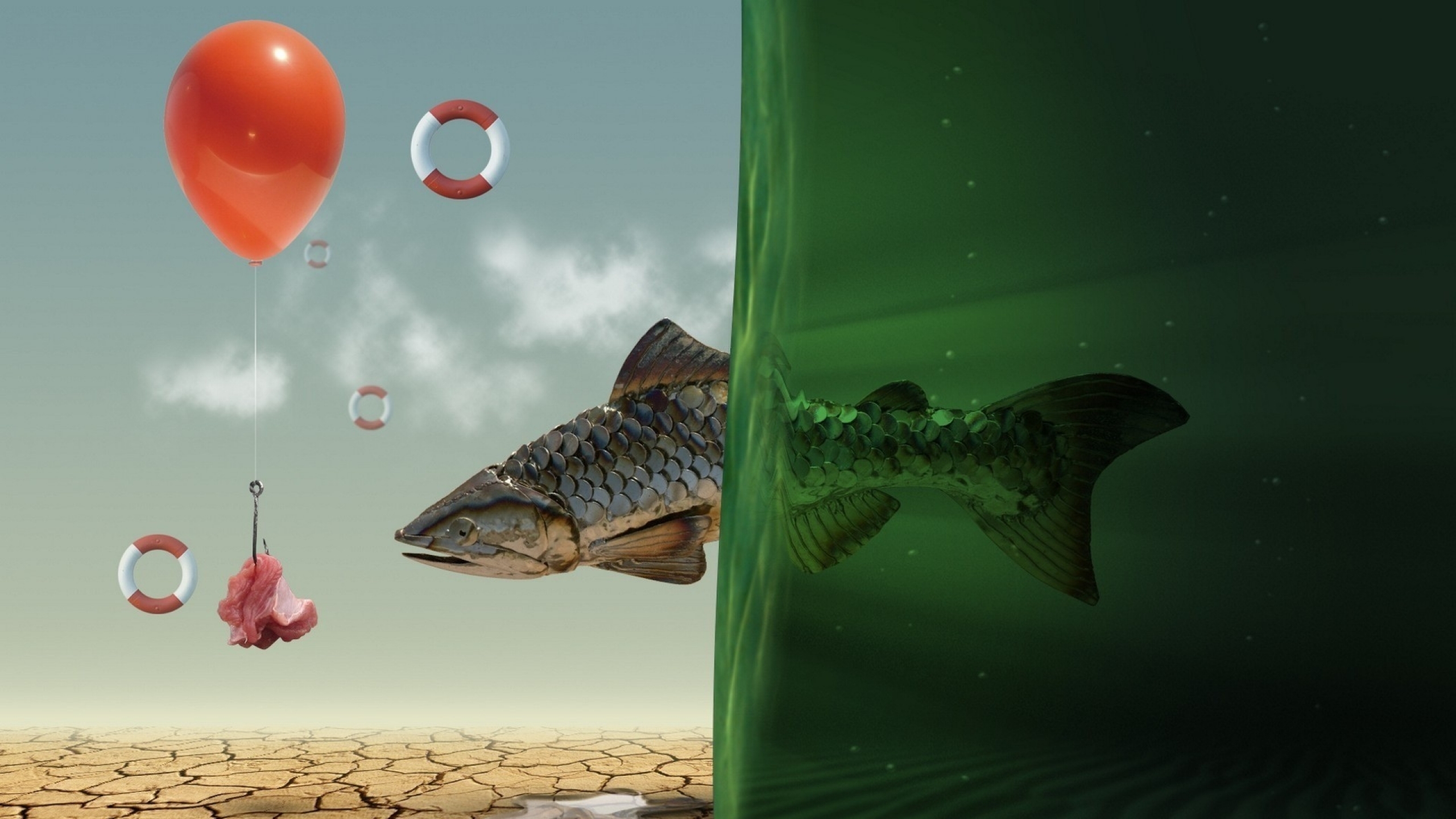 Description: A fish is hooked to a hook with a balloon in the air and a fish is hanging from a hook.
