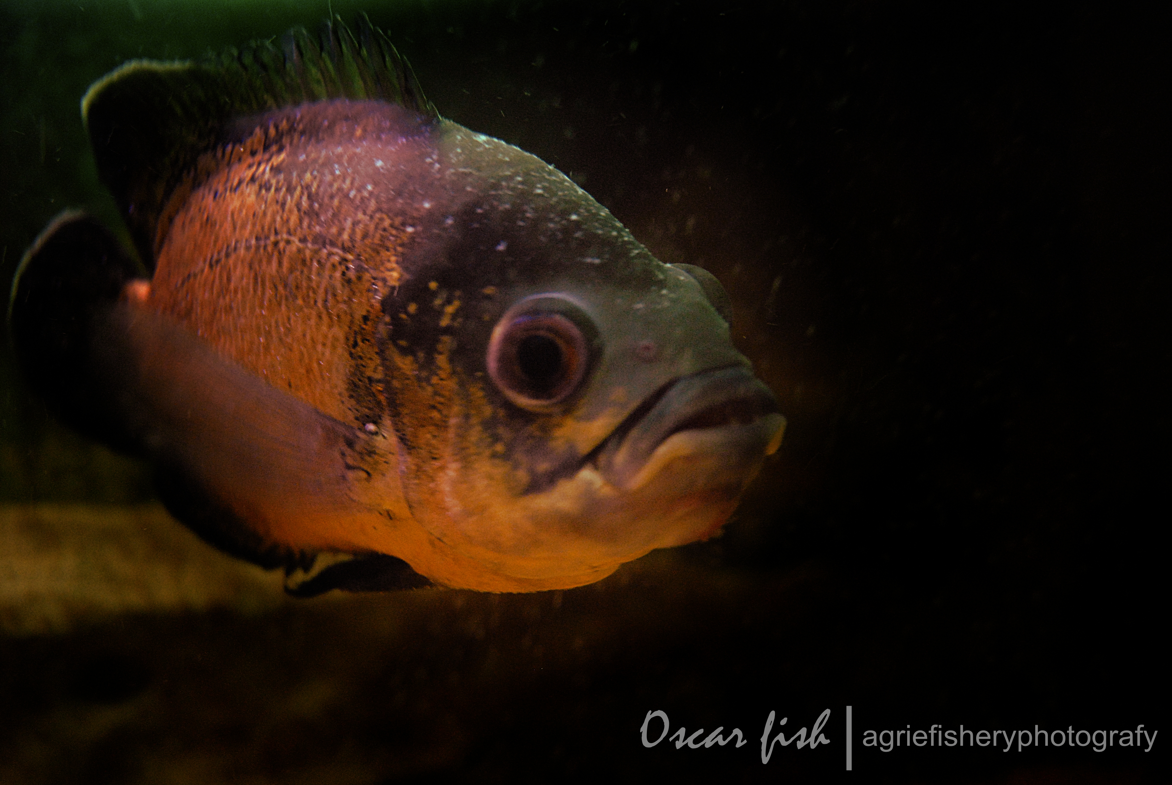 Description: A fish with a black background and a red and yellow stripe around its eyes and head.